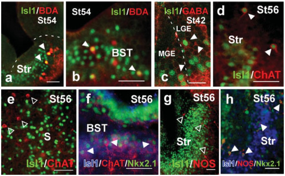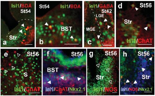 the Isl1-positive striatum, respectively. In (f) arrowheads