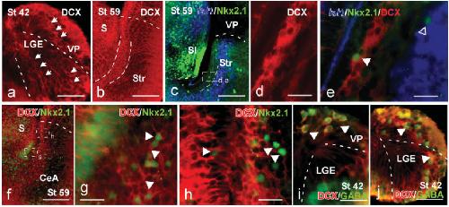 Figure 6 Doublecortin telencephalic expression: double labeling with Nkx2.1 and GABA.