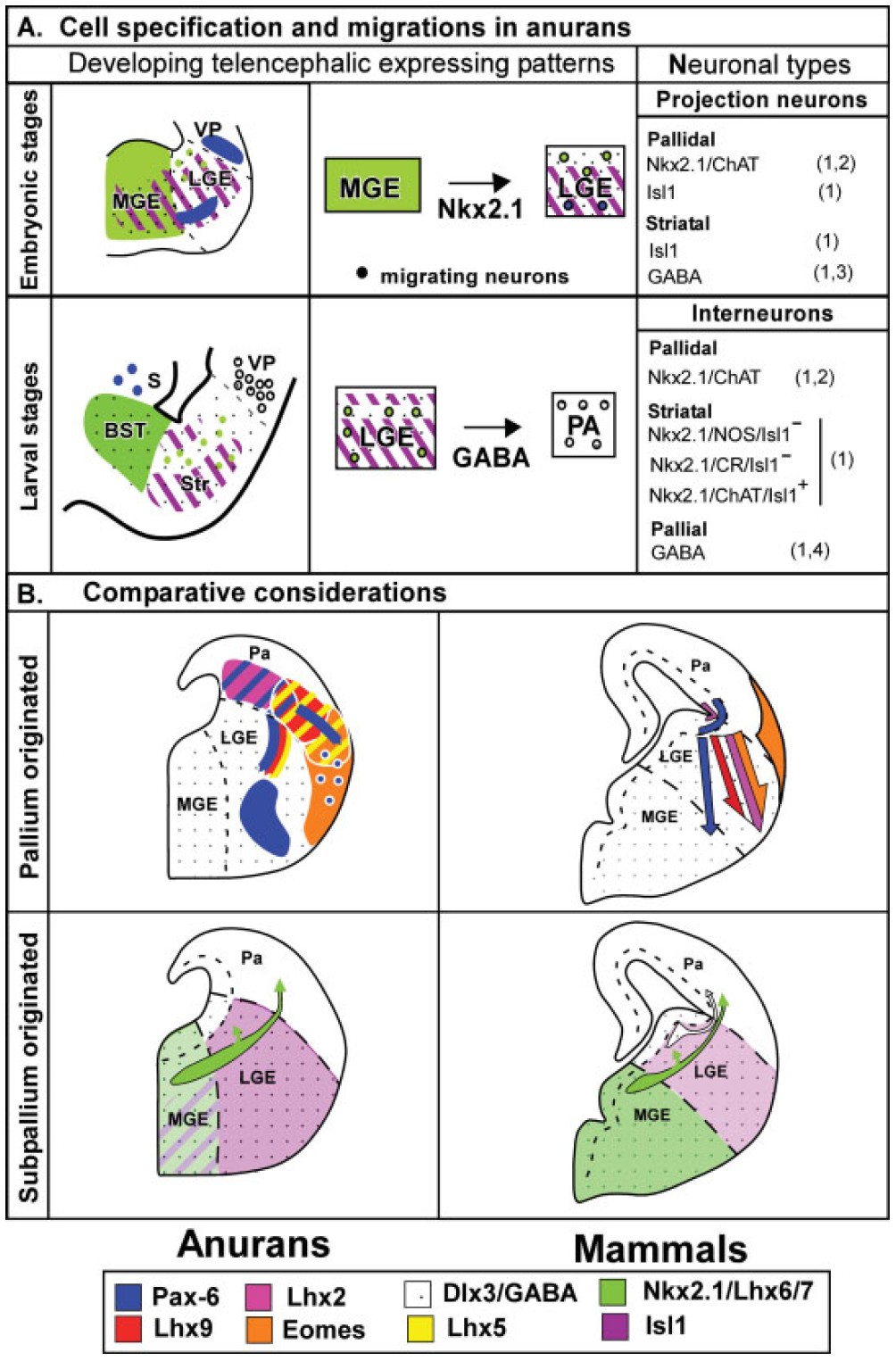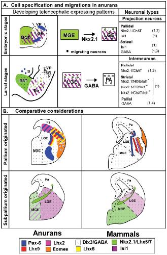 Figure 9 Summary drawing for cell specification and migrations in Xenopus and mouse forebrain.