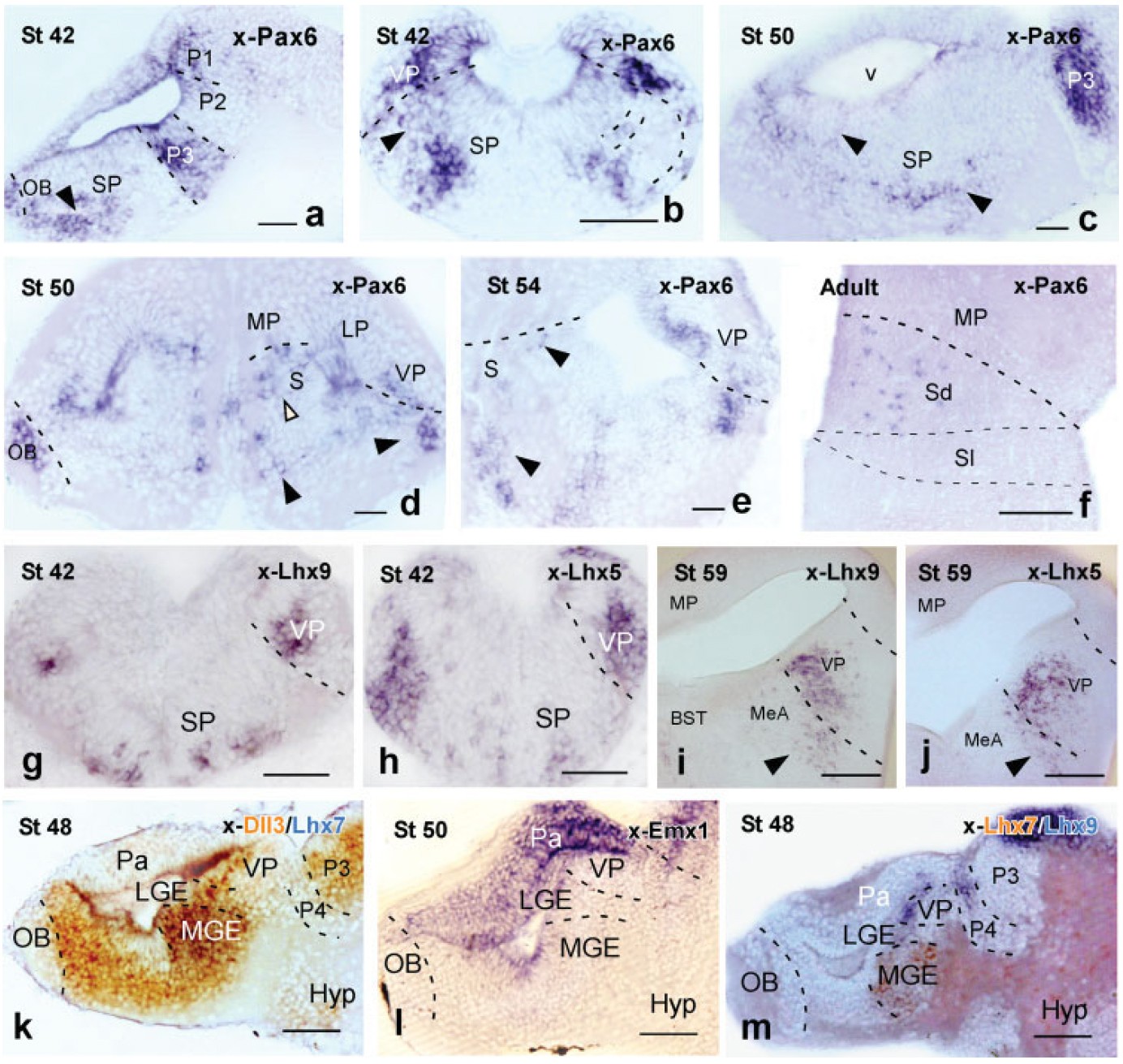 point to xLhx5/9-expressing cells in the medial amygdala (i, j). (kâm) Expression of x-Dll3/x-Lhx7 (k),