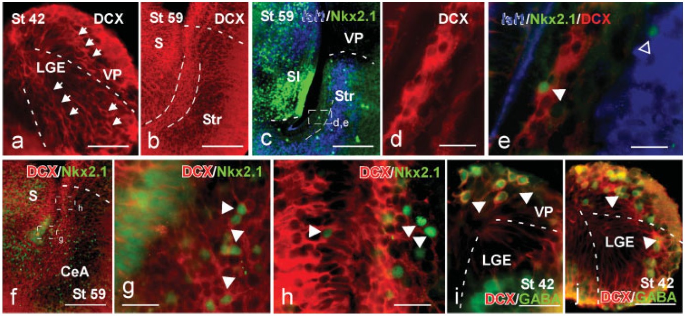 Transverse sections after single (a, b, d), double (c, f–j) and triple (e) labeling for DCX, Isl1,