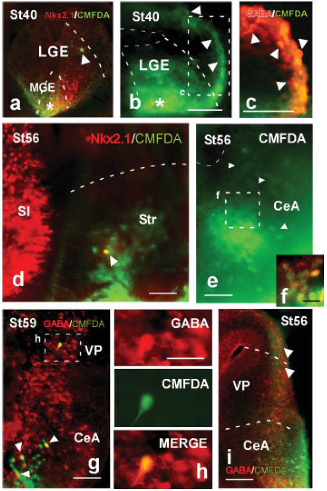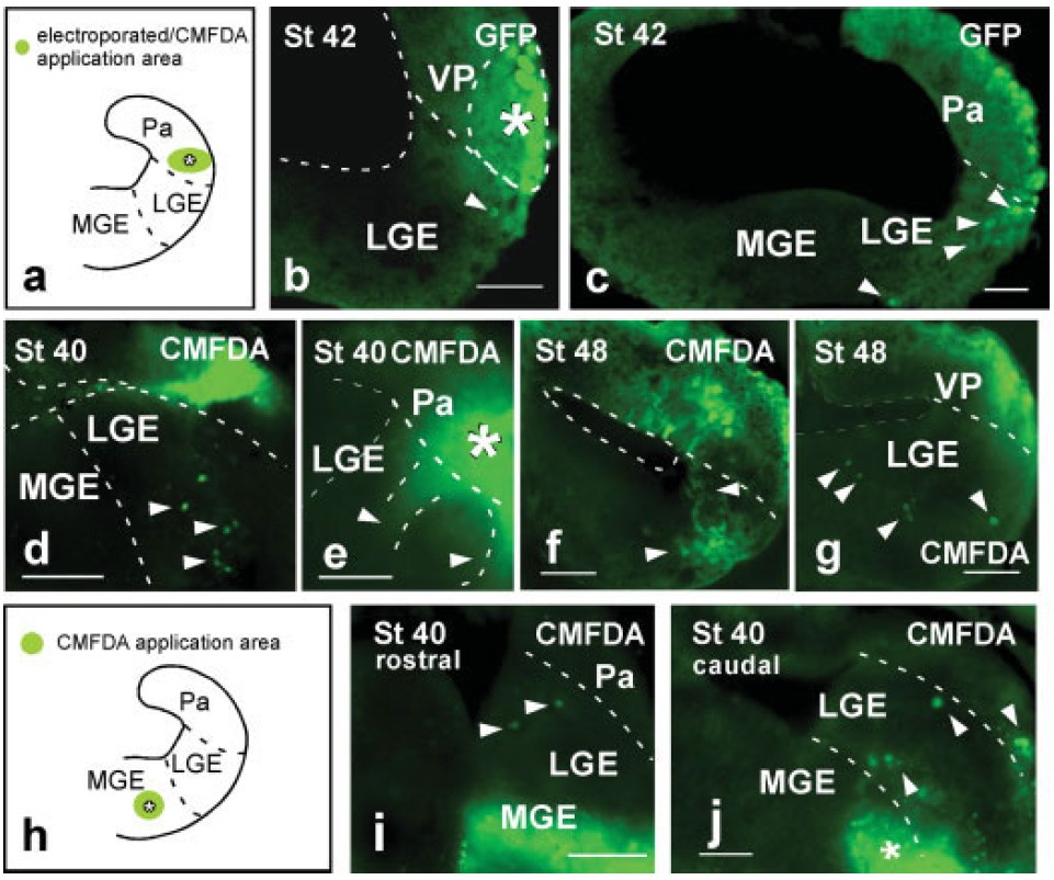 cells in the subpallium. (d–g) Photomicrographs after small (d, f, g, i, j) or large (e) CMFDA applications