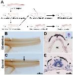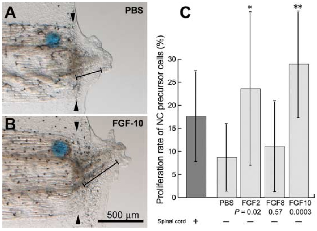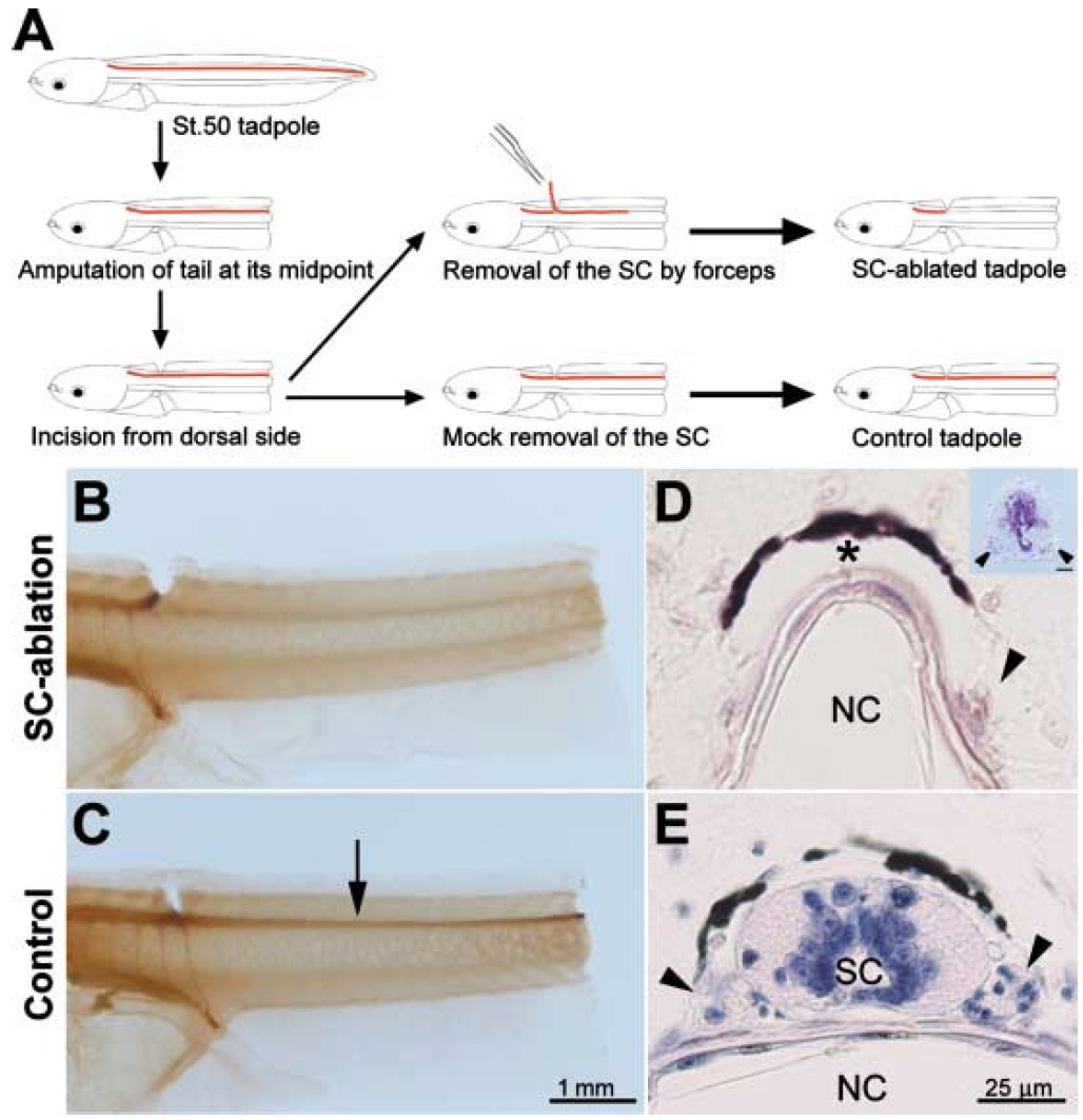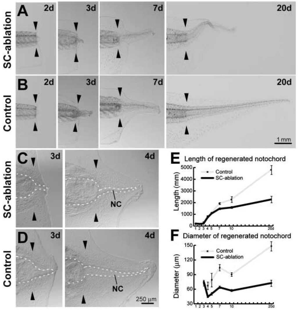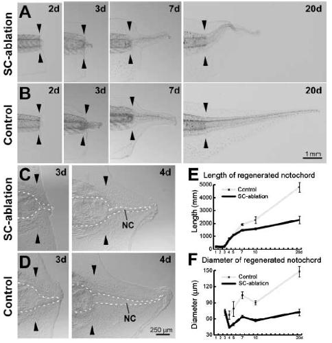 ???displayArticle.abstract??? Tail regeneration in urodeles is dependent on the spinal cord (SC), but it is believed that anuran larvae regenerate normal tails without the SC. To evaluate the precise role of the SC in anuran tail regeneration, we developed a simple operation method to ablate the SC completely and minimize the damage to the tadpole using Xenopus laevis. The SC-ablated tadpole regenerated a twisted and smaller tail. These morphological abnormalities were attributed to defects in the notochord (NC), as the regenerated NC in the SC-ablated tail was short, slim and twisted. The SC ablation never affected the early steps of the regeneration, including closure of the amputated surface with epidermis and accumulation of the NC precursor cells. The proliferation rate of the NC precursor cells, however, was reduced, and NC cell maturation was retarded in the SC-ablated tail. These results show that the SC has an essential role in the normal tail regeneration of Xenopus larvae, especially in the proliferation and differentiation of the NC cells. Gene expression analysis and implantation of a bead soaked with growth factor showed that fibroblast growth factor-2 and -10 were involved in the signaling molecules, which were expressed in the SC and stimulated growth of the NC cells.