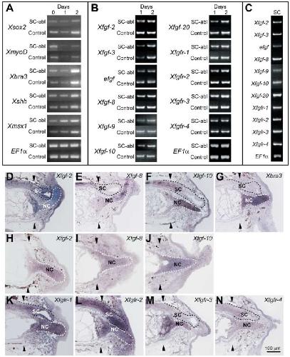 of Xfgf-2, -8, and -10 (DâF) and Xfgfr-1, -2, -3, and -4 (KâN) was analyzed on the regenerating tail. Expression of Xbra3 was analyzed