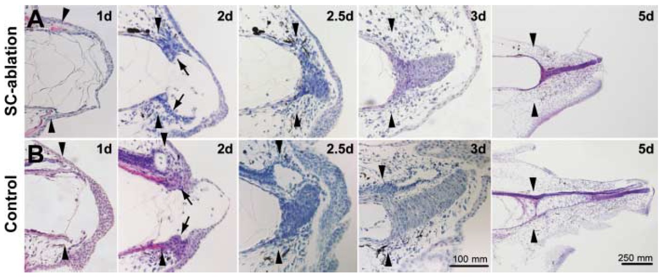 (5 d). The SC ablation resulted in a reduced size of the compact cell mass (2.5 d, 3 d) and delayed vacuolation (5 d). A pair of