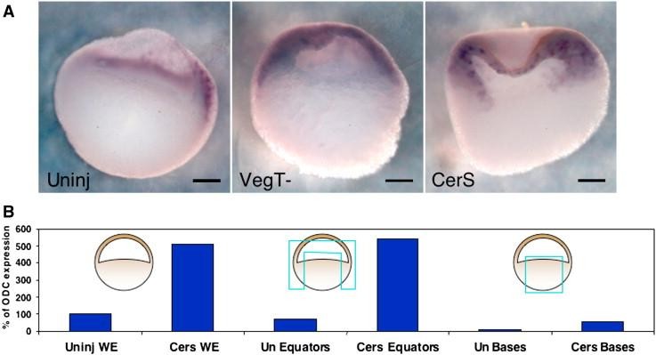 Fig. 3. VegT and Nodal signaling act at long-range to affect FoxI1e expression in the animal cap. (A) In situ hybridization in VegT-depleted and CerS-injected embryos shows FoxI1e is most upregulated in the animal cap rather than the vegetal mass at stage 10. Dorsal is the to the right in the bisected uninjected embryo. The VegT and CerS embryos did not dorsal axes. (B) Vegetal masses stripped of all mesoderm contamination dissected from control and CerS-injected embryos confirm that the vast majority of increase in FoxI1e expression is derived from non-endodermal tissue. Scale bars represent 200 μm.