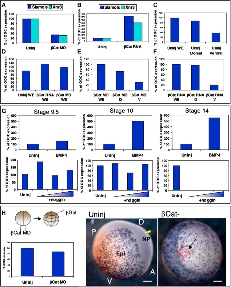 Fig. 2. Wnt-dependent dorsal axis formation controls late, but not early, FoxI1e expression. Embryos injected with 40 ng β-Cat MO had reduced levels of direct targets Siamois and Xnr3 at stage 10 (A), and embryos injected with 50 pg β-Cat mRNA had increased levels (B). In control explants, the level of FoxI1e was higher in dorsal halves than ventral halves (C). The total level and distribution of FoxI1e was unchanged by β-Cat MO or mRNA (DâF). (G) Levels of FoxI1e mRNA at stages 9.5, 10, and 14 (compared to ODC mRNA levels at each stage) in embryos injected with either 100 pg BMP4 mRNA (upper panels), or 10, 40, or 160 pg of noggin mRNA (lower panels). Neither BMP4 overexpression, nor inhibition using Noggin, consistently affected the level of FoxI1e expression at the late blastula stage (stage 9.5). By the early gastrula stage (stage 10), BMP4 overexpression increased FoxI1e expression, but Noggin still had little effect. Expression of FoxI1e in the early neurula (stage 14) was increased by BMP4 overexpression and completely ablated by Noggin. This indicates that the early expression of FoxI1e is BMP-independent, but that the restriction of FoxI1e to the epidermis at neurulation is BMP-dependent. (H) Overall level of FoxI1e expression at stage 14 is unaffected by β-Cat MO. Embryos injected with 40 ng β-Cat MO at the 2-cell stage were injected with β-Gal at the 32-cell stage in the A1 blastomere. Red-gal staining, and FoxI1e in situ hybridization were carried out at stage 14. The anterior (A), posterior (P), dorsal (D), and ventral (V) regions of the embryo are marked in the control embryo, with the derivatives of the dorsal animal blastomere (A1), marked by the yellow arrowhead in the neural plate. Embryos lacking β-Cat (right panel) lack axes altogether. The red-gal positive cells (arrowed) mark the derivatives of the A1 blastomere. FoxI1e expression in β-Cat-depleted embryos persists in that clone of cells, indicating the β-Cat dependence of restriction of FoxI1e from the prospective CNS. The reddish cast toward the posterior end of the uninjected embryo is residual maternal pigment, not affected by bleaching. Scale bars represent 200 μm.