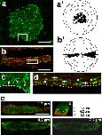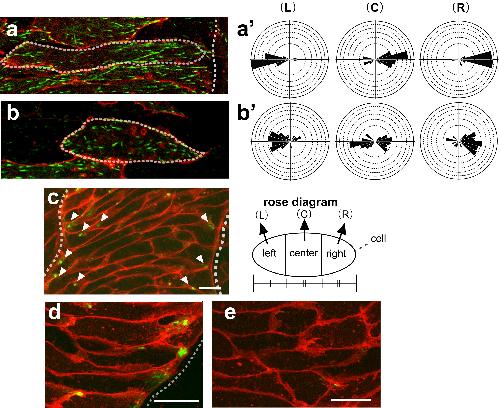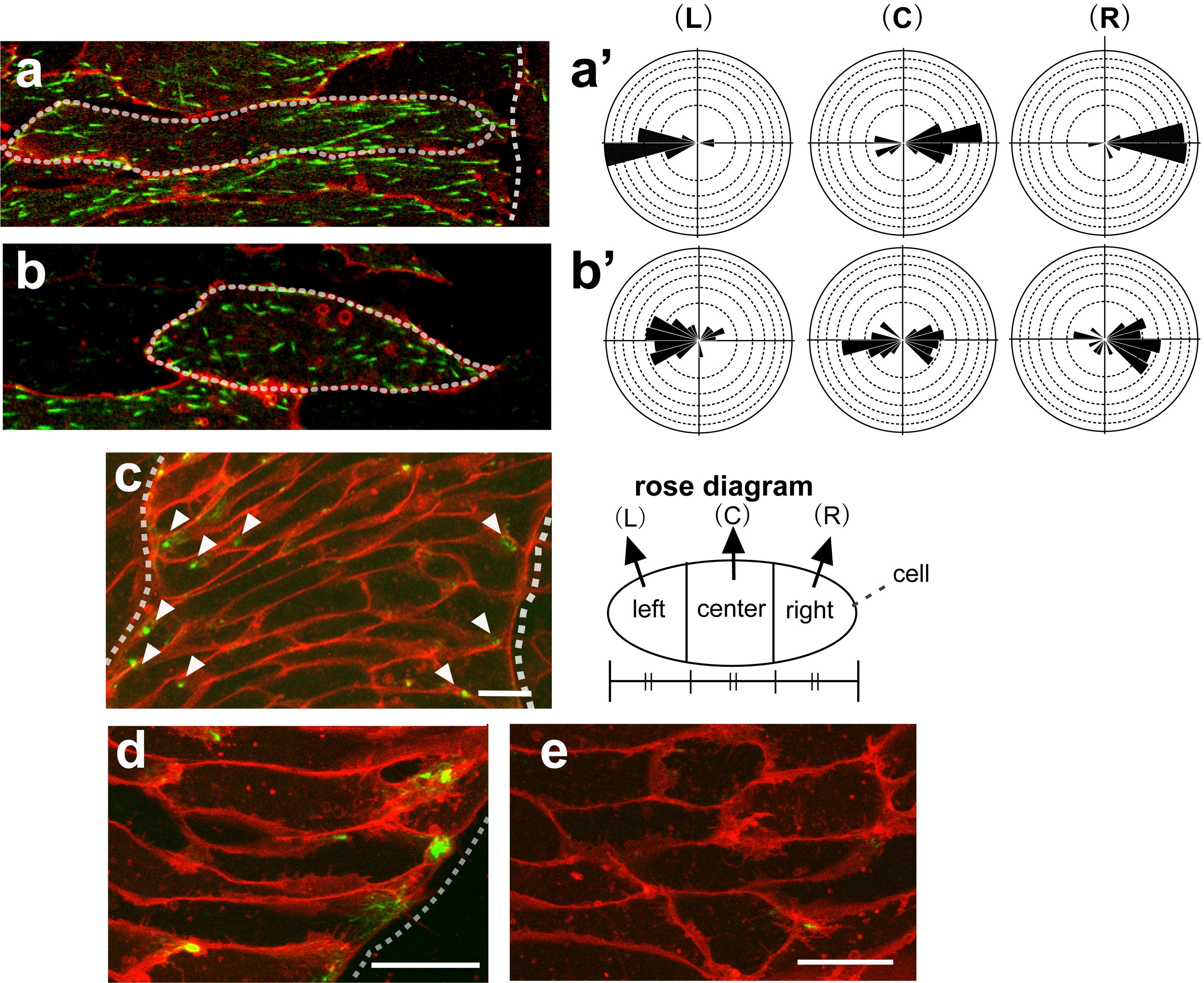 (a) A relatively late notochord cell (Stage 13~) that was proximal to the boundary. The cell was divided into three regions (left: L, center: C, right: R) of equal horizontal (mediolateral) length for tracking the EB3 comets to clarify the direction of their movement. The EB3 movements were highly biased and mostly rightward in the center portion (a'). (b) A late notochord cell (Stage 13~) that was distant from the boundary. No significant bias of the EB3 movement was observed (b'). (c) APC-GFP localization in the notochord in Keller explant. (d) APC-GFP localization in the chordamesoderm cells near the boundary in Keller explants. The localization was restricted to the one cell end pointing toward the boundary. (e) APC-GFP localization in the chordamesoderm cells located in the center of the notochord. Note that the localization was diffuse and unfocused. The dotted line indicates the notochord-somite boundary, and arrowheads indicate the localization of APC-GFP. Scale bars, 20 . Each scale of the rose diagrams corresponds to 10%.
