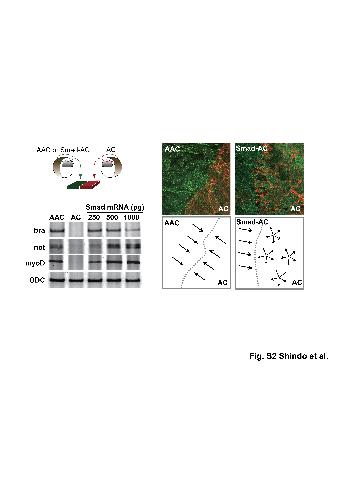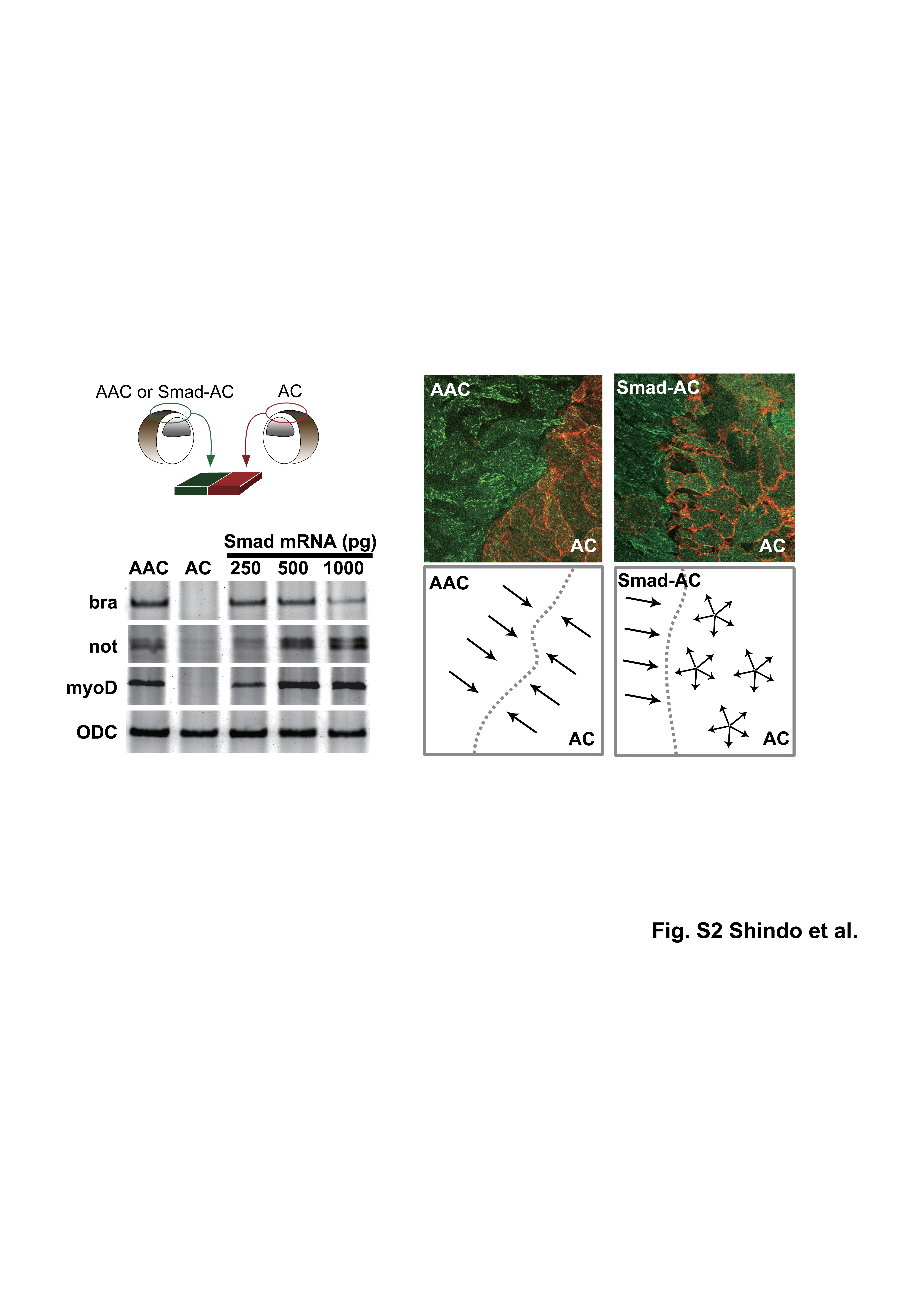 Figure S2. Smad 2 is an intracellular component of activin/nodal signaling, thus smad2-expressing AC induced chordamesoderm tissue cell autonomously. RT-PCR analysis showed that AC receiving over 250 pg smad2 mRNA expressed the chordamesoderm marker. When the AC was co-cultured with Smad2-AC, EB3 in the AC cells moved randomly, unlike that in the AC cells co-cultured with Activin expressing AC, which moved toward the boundary in a mirror image. These results suggest that the boundary between two distinct tissues has information to attract the EB3 movement; moreover, the attracting cue is specific for chordamesoderm tissue, because the EB3 in the AC moved randomly near the tissue boundary.