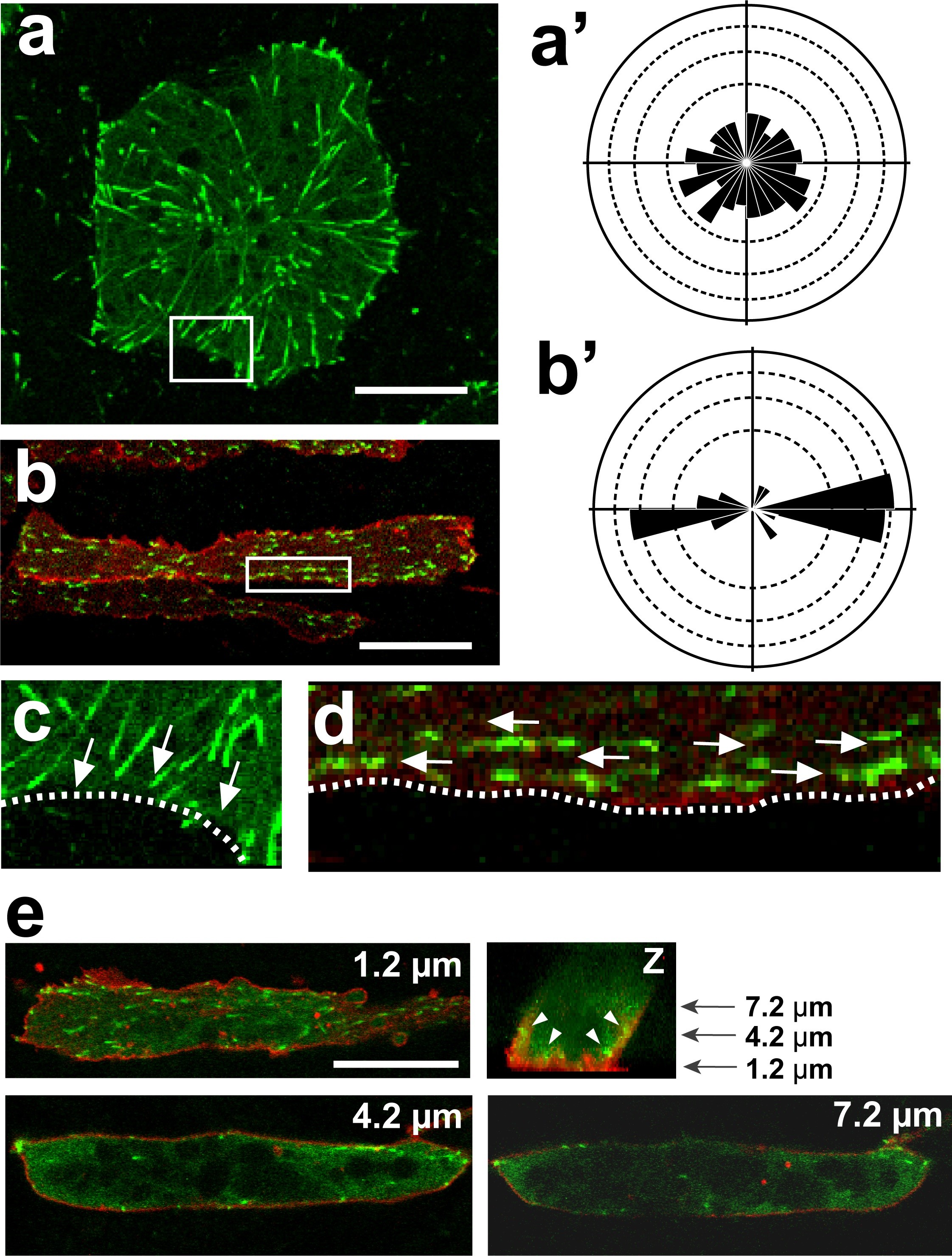 (a) In an animal cap cell, EB3-GFP molecules show radially symmetrical movement toward the rim of the cell in the rose diagram (a'). (b) In a chordamesoderm cell, the movement was mostly bidirectional toward both ends of the cell (b'). (c, d) Magnification of the membrane region (white box) of a and b shows that EB3 moved toward the cytoplasmic membrane and disappeared after attaching to it in an animal cap cell (c), while EB3 moved along the membrane in a dorsal mesoderm cell. Arrows show the direction of the EB3 movement, and dotted lines indicate the cytoplasmic membrane. (d). (e) Z section of chordamesoderm cell reveals that most of the EB3 comets are observed in the plane, which is 1.2 from glass dish. In the planes, which are 4.2 and 7.2 from glass dish, the yolk granule were located in the center region of the cell and EB3 comets were located only near the cytoplasmic membrane (white arrow heads). Scale bars, 20 . Each scale of the rose diagrams corresponds to 10%.