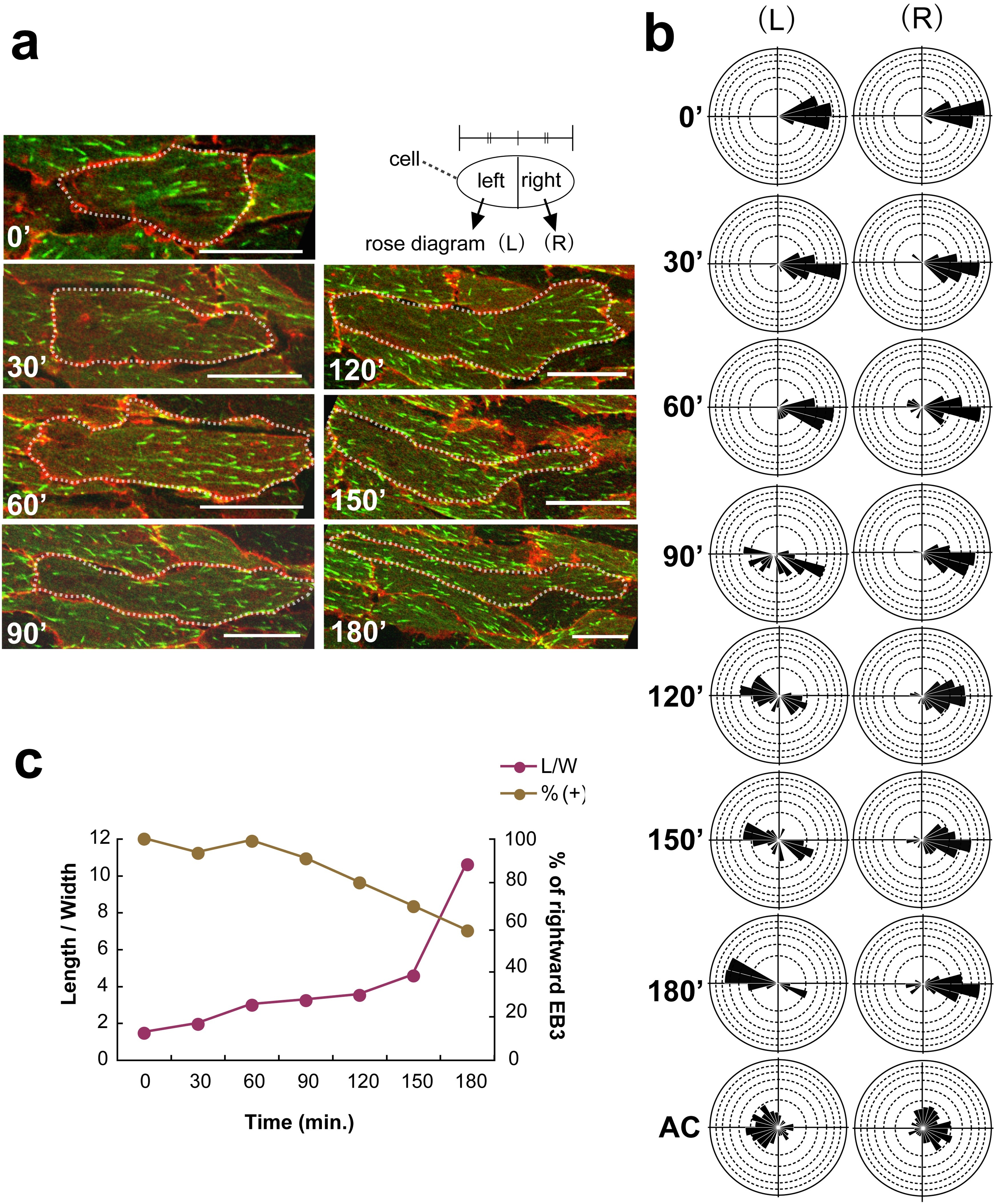 (a) Time course of cell-shape change from 0' to 180' in Keller explants. The dashed lines outline the shape of the cells. (b) Rose diagrams of EB3 movement in the indicated cells. Each cell was divided into left and right portions at the center of the horizontal (mediolateral) cell length, and the EB3 movements in each portion were plotted as rose diagrams. (L) Left and (R) right. (c) Correlation between cell shape (length/width) and bias of EB3 movement (rightward EB3; −45to +45. Note the biased rightward movement without significant cell-shape change. Scale bars, 20 . Each scale of the rose diagrams corresponds to 10%.