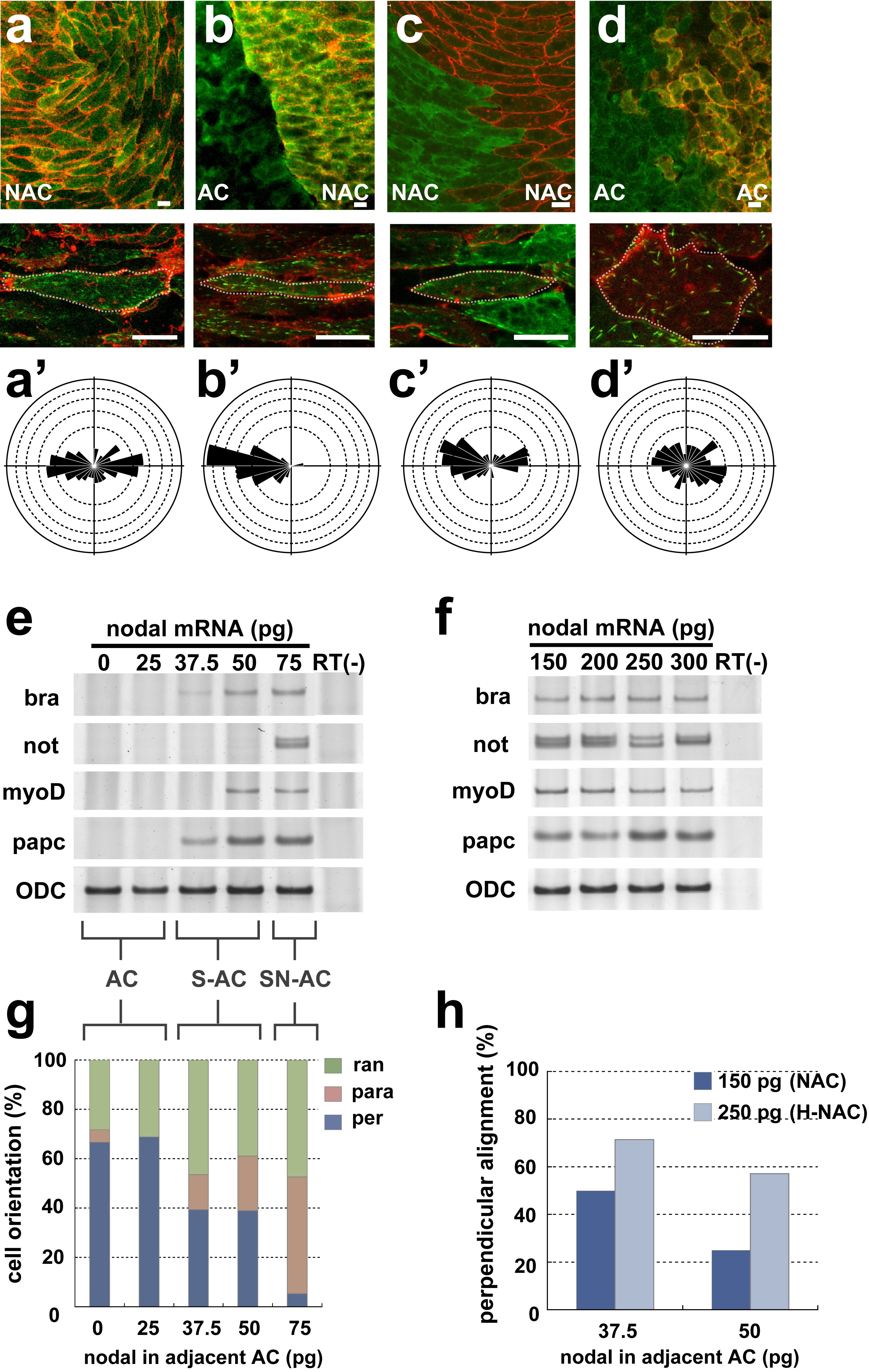 (a) The single culture of animal cap expressing a high concentration of Nodal mRNA (12550 pg: NAC). (b) Combined culture of uninjected animal cap (AC) and NAC. Homogenous combined cultures of NAC (c) and AC (d). The EB3 in the cells in panels a respectively, was tracked. (a'') Rose diagrams of the EB3 movements in cells a. (e) RT-PCR (reverse transcription-polymerase chain reaction) analysis of low concentration of Nodal-mRNA (255 pg) injected animal caps. Animal caps into which a relatively high concentration of Nodal mRNA (75 pg: SN-AC) was injected expressed the chordamesoderm and somite marker, Xnot and XmyoDa, papc, and those receiving a relatively low concentration of Nodal mRNA (37.50 pg: S-AC) expressed only the somite marker, XmyoD. (f) RT-PCR analysis of high concentration of Nodal-mRNA (150 pg00 pg: NAC, H-NAC). (g) The angle of the cell body in relation to the border in NAC (150 pg) combined with explants treated with different Nodal levels (05 pg of mRNA). Cell alignment perpendicular to the boundary, representing the mediolateral polarity, was observed when the combination was heterogeneous and loss when the combination became more homogeneous (37.55 pg). (per: perpendicular, para: parallel, ran: random) (h) The ratio of perpendicularly aligned cells in relation to the border was altered by difference of nodal signaling level. The cells in H-NAC (250 pg) tended to align perpendicular to the border with S-AC (37.50 pg). Scale bars, 20 mm (a). Each scale of the rose diagrams corresponds to 10%.