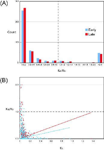 Figure 2. Functional constraints are similar in early and later stages of duplicate gene evolution in X. laevis paralogs. (A) Binned Ka/Ks of early (blue) and later (red) stages of duplicate gene evolution. (B) Regression of Ka/Ks versus Ks in the early and later stages indicates that selection (relaxed purifying + positive) is not more common in the early stage of duplicate gene evolution (blue dots) than the later stage (red dots). The Y-intercept of these regression lines was set to zero and Ka/Ks ratios greater 2 (including undefined ratios) were given a value of 2. In (A) and (B), a dashed line indicates the neutral expectation. Fragments with Ka/Ks > 2 are, on average, half of the size of those with Ka/Ks < 2. Ka/Ks ratios above 2 may therefore be attributable in part to stochastic variance in Ks [43].