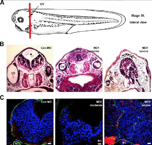 Figure 4. RASSF7 knockdown causes pronounced neural tube defects. (A) Schematic representation of a stage 39 Xenopus tadpole indicating the anterior/posterior level that sections were taken. Diagram adapted from a Xenbase image, based on previous work (Nieuwkoop and Faber, 1967). The sections cut through the otic vesicle (OV). (B) Stage 39 embryos injected with either Con MO or MO1 were sectioned and stained with hematoxylin and eosin. The ventricular cavity (â´) is reduced in MO1 injected embryos compared with control sections and is termed âmoderately affectedâ or is completely lost and is therefore termed âseverely affected.â In MO1-injected embryos, cells spread from the pial regions of the brain into areas normally occupied by connective tissue (arrows). (C) Developing braintissue was stained with polarity markers: anti-laminin (green), phalloidin (red), and counterstained with DAPI (blue). Images were from an AP position similar to that in A and focus on the neural tube, just above the notochord (NC). Tissue polarity is disrupted in both the moderately and severely affected tissues. All bars, 10 μm.