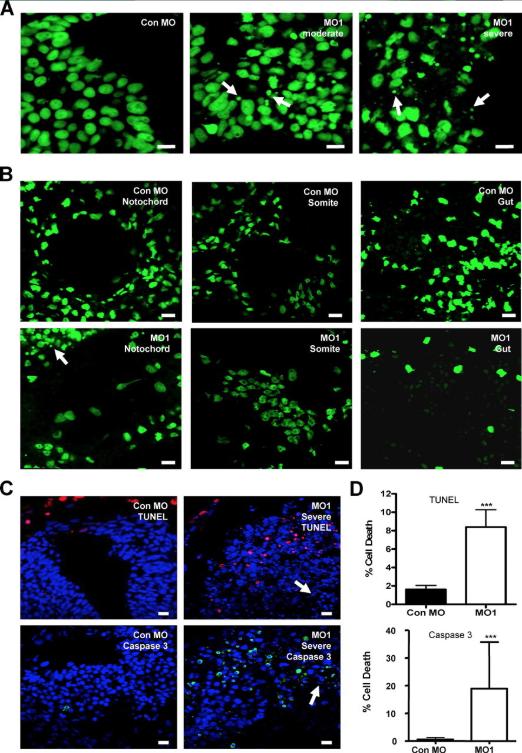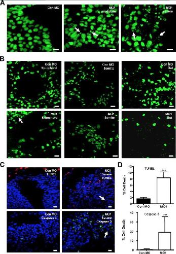 Figure 5. RASSF7 knockdown results in nuclear fragmentation and cell death in the developing neural tube. (A) Sytox Green staining of neural cells in MO injected embryos. Nuclear fragments of varying sizes (arrows) are observed in RASSF7 knockdown tissues, which are not present in the control tissues. (B) Nuclear fragments are not observed in the notochord, somites, and developing gut (endoderm) of RASSF7 knockdown embryos, as indicated by sytox green staining. These are tissues where RASSF7 expression was not observed. Affected neural tissue spreading toward the notochord is highlighted by an arrow in the MO1 notochord image. (C) Sections of neural tissue were TUNEL stained (red) or anti-active caspase 3 (green), and DAPI counterstained (blue). Arrows indicate fragmented nuclei that are not apoptosis-positive. (D) Graphs indicate percentage of cell death. *** p< 0.001, n = 9 from three experiments for both MOs (TUNEL); and n = 3 from three independent experiments for both MOs (active caspase 3). More than 7000 cells were counted for each individual specimen. Error bars, SD. All bars, 10 μm.