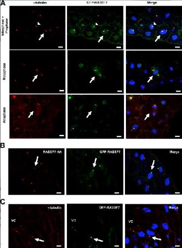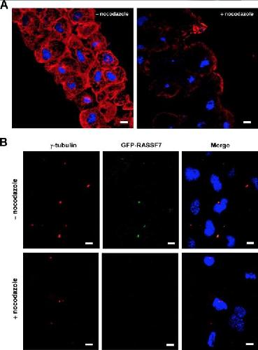 Figure 8. The centrosome localization of RASSF7 requires microtubules. (A) Microtubules are lost in cells treated with 20 μg/ml of nocodazole for 2 h. Microtubules of the animal cap from stage 10 embryos were stained using α-tubulin (red), and the cell nuclei were visualized using DAPI (blue). (B) Nocodazole treatment resulted in a loss of GFP-RASSF7 (green) localization at the centrosome. γ-tubulin was used to stain the centrosomes (red) and nuclei counterstained with DAPI (blue). All bars, 10 μm.