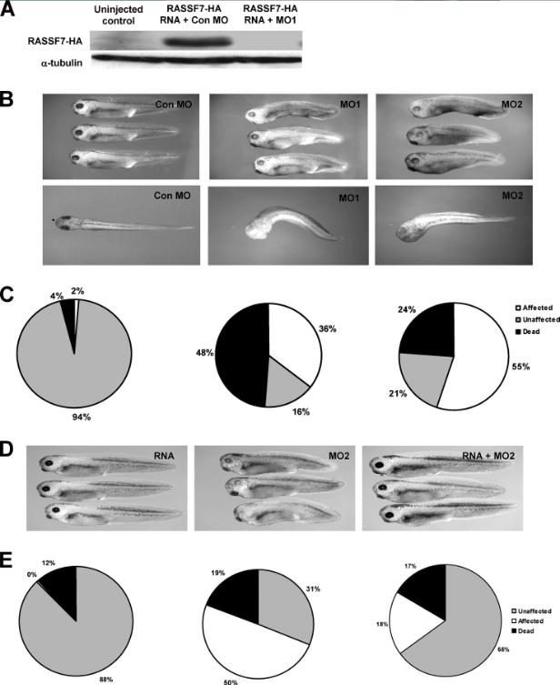 Figure 3. Knockdown of RASSF7 expression causes developmental defects. (A) Immunoblot of HA-tagged RASSF7 (56 kDa) from uninjected and MO injected embryos at stage 16. Injected embryos were injected with 20 ng of MO and 2 ng of HA-RASSF7 RNA into both cells at the two-cell stage. α-tubulin is shown as a loading control (50 kDa). MO1 is able to eliminate tagged RASSF7 in the embryos. (B) Lateral and dorsal views of Xenopus embryos injected with morpholinos (MOs), two RASSF7 MOs (MO1 and MO2), and a control MO (Con MO). RASSF7 knockdown embryos display a short and bent body axis, with reduced eye pigmentation and developmental delay. (C) Percentages of affected embryos for each MO at stage 39, calculated from four independent experiments (Con MO, n = 375; MO1, n = 359; MO2, n = 345). (D) Phenotypic rescue was achieved for MO2 by injection of RASSF7 RNA. (E) Quantification of the rescue experiment (percentages calculated from three independent experiments; RNA, n = 157; MO2, n = 171; RNA plus MO2, n = 166).