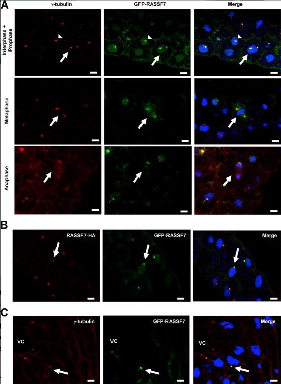 Figure 7. RASSF7 localizes to the centrosomes. (A) Embryos were injected with GFP-RASSF7 at the two-cell stage, cultured until stage 10, fixed, sectioned, and stained as described in materials and methods. GFP-RASSF7 (green) colocalized with γ-tubulin (red) during interphase and prophase (arrow head and arrow, respectively) and during metaphase and anaphase (arrows). Sections were counterstained with DAPI (blue). The localization has been repeated in more than three independent experiments. (B) RASSF7-HA (red) and GFP-RASSF7 (green) exhibit the same localization in stage 10 embryos. Interphase cells shown. (C) Later stage embryos (stage 20) also have centrosome localized GFP-RASSF7 (green), as indicated by γ-tubulin (red). Image shows the neural tube of a stage 20 embryo. VC, ventricular cavity. All bars, 10 μm. RASSF7 colocalizes with γ-tubulin throughout the cell cycle.