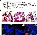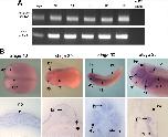 Figure 2. RASSF7 expression in developing Xenopus embryos. (A) RT-PCR analysis of early Xenopus development for RASSF7 and as a control, the ornithine decarboxylase (ODC) gene. Thirty cycles were used in the PCR. RASSF7 exhibits both maternal and zygotic expression. (B) Tissue-specific expression patterns of RASSF7 analyzed by in situ hybridization at stages 16, 20, and 30. A wholemount and transverse section is shown for each stage. ep, epidermis; np, neural plate; ey, eye; br, brain; nt, neural tube; pn, pronepheros; lm, lateral plate mesoderm; ba, branchial arches; ov, otic vesicle; and tg, trigeminal ganglion. There is prominent expression of RASSF7 in many embryonic tissues.