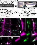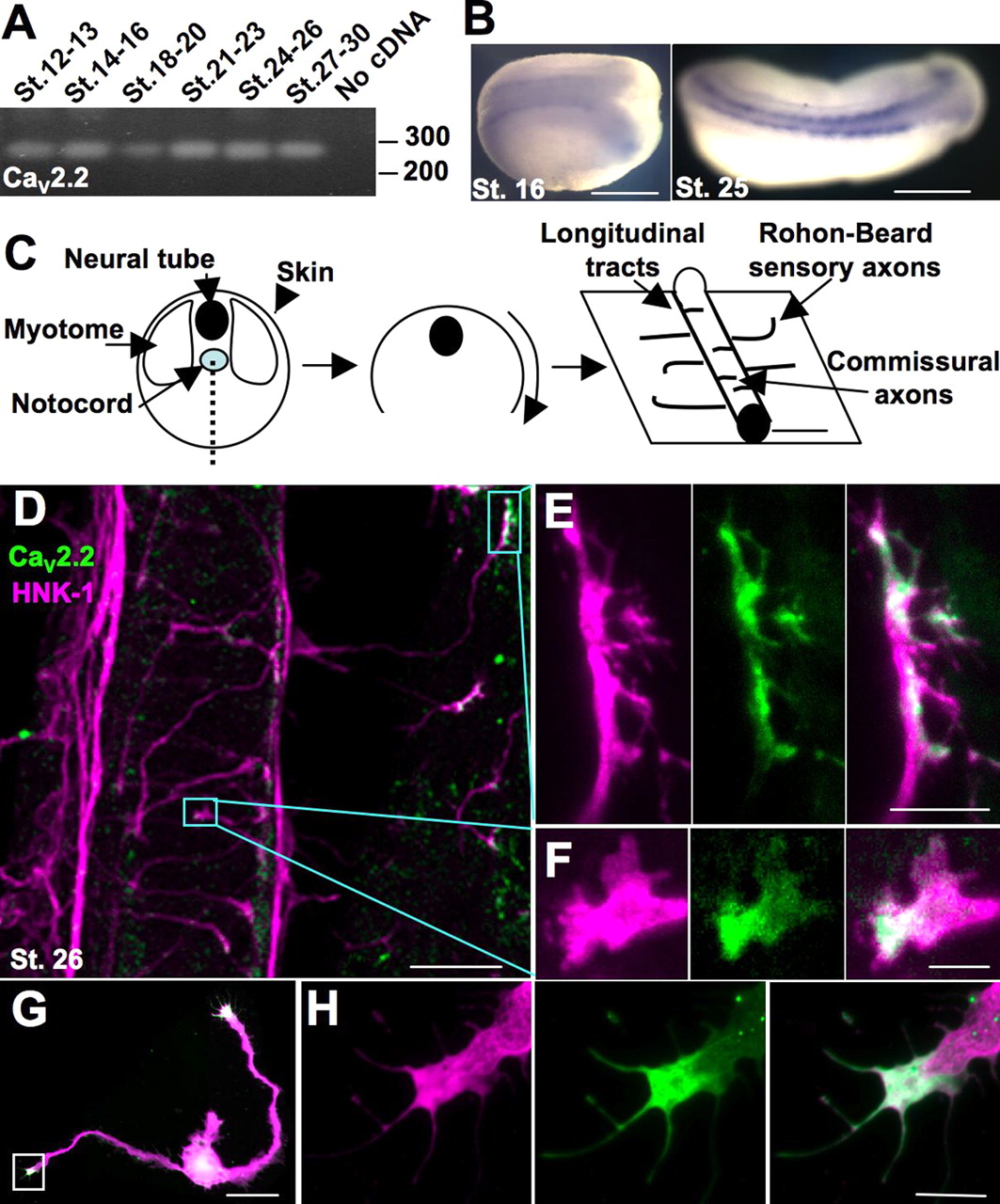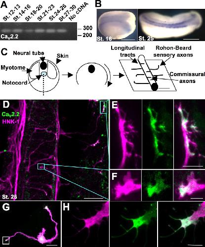 CaV2.2 is expressed in the developing Xenopus neural tube and is localized to the growth cone during axon outgrowth in vivo and in vitro. A, RT-PCR of a 272 base pair fragment of CaV2.2 using mRNA collected from dissections of dorsal halves of embryos from stages (St.) 12â30. B, In situ hybridization using the probe made from the same fragment reveals expression of CaV2.2 in the developing neural tube. Scale bar, 500 μm. C, Schematized dissection for immunostaining: a ventral incision was made to remove the myotomes and notochord and reveal the neural tube and skin. Staining with the neuronal marker HNK-1 reveals longitudinal tracts running anteroposteriorly, axons of sensory Rohon-Beard neurons innervating the skin, and commissural interneurons crossing the ventral midline. D, Ventral view of a spinal cord and skin of a dissected embryo stained for HNK-1 (purple) and CaV2.2 (green). Boxes outline the CaV2.2-positive growth cones pictured in E and F. Scale bar, 50 μm. E, Sensory Rohon-Beard growth cone expressing CaV2.2 (green). Scale bar, 10 μm. F, Commissural interneuron expressing CaV2.2 (green). Scale bar, 5 μm. G, Cultured neuron stained for β-tubulin (purple) and CaV2.2 (green) expressing CaV2.2 in the growth cone. Scale bar, 50 μm. H, Growth cone boxed in G. Scale bar, 10 μm.