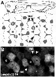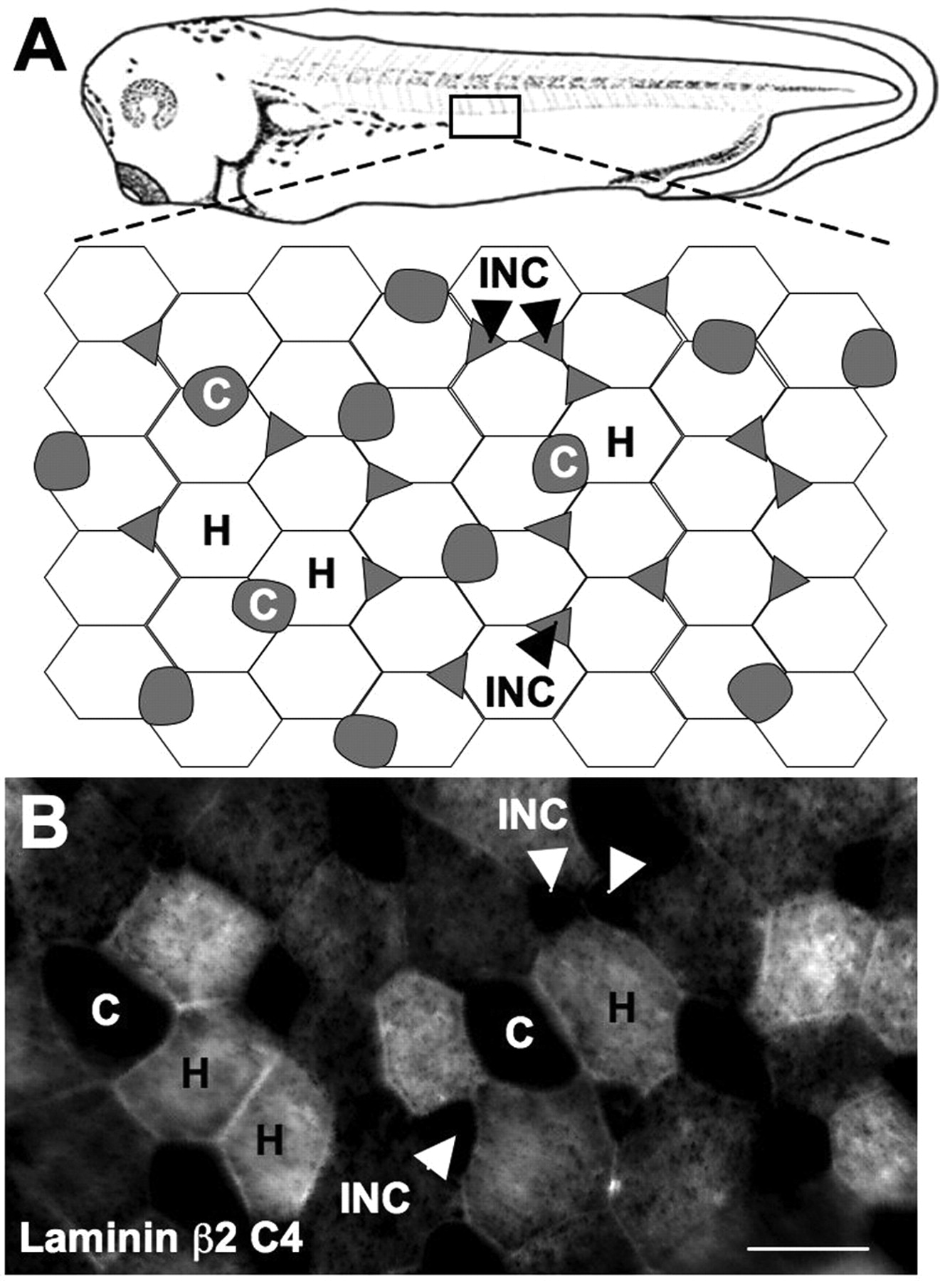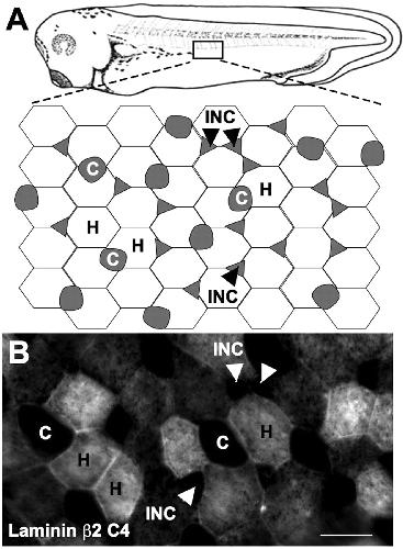 Laminin β2 is expressed in a tiled pattern in the skin. A, Schematic of Xenopus skin. B, Whole-embryo staining with the C4 antibody to laminin β2 revealed expression coextensive with hexagonal epithelial (H) cells but not ciliated (C) or intercalating nonciliated cells (INC) in stage 34 larvae. Scale bar, 25 μm.