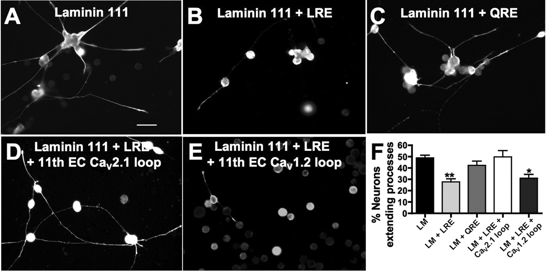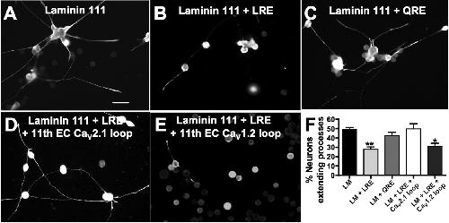 Laminin β2 specifically inhibits spinal neurite outgrowth. Xenopus neurons from stage 17 embryos were cultured on the following substrates and analyzed at 14â18 h in vitro: A, laminin (LM) with a β1 but not a β2 chain; B, a solublized 20 kDa LRE containing C-terminal fragment of laminin β2; C, a point-mutated (LREâQRE) laminin β2 fragment. Neurons identified by immunostaining for neuron-specific β-tubulin extended significantly fewer processes on substrates containing the LRE fragment compared with QRE or nonlaminin β2 substrates. Scale bar, 50 μm. D, Incubating neurons cultured on laminin plus the β2 LRE fragment with a competing peptide corresponding to the 11th extracellular LRE-binding loop of rat CaV2.1 (91% homologous to Xenopus CaV2.2) rescued neurite extension. E, Incubation with a control peptide corresponding to the 11th extracellular loop of rat CaV1.2 (61% homologous to Xenopus CaV2.2) did not prevent inhibition by laminin β2 LRE. F, Laminin β2 LRE significantly reduces the number of neurons extending processes in vitro. This effect is rescued by incubation with the competing CaV2.1 loop peptide (**p < 0.01, *p < 0.05, comparison to LM control; n ⥠300 neurons from â¥6 cultures). Error bars indicate SEM.