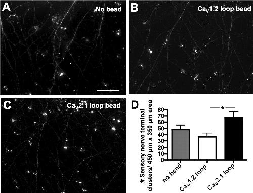 Blocking CaV2.2–laminin β2 interactions in vivo leads to increased innervation of the skin. A–C, Agarose beads soaked in 10 μM CaV2.1 or CaV1.2 11th extracellular loop peptide were implanted in stage 16 embryos. After 1 d, stage 34 embryos were fixed and stained with anti-HNK-1 to reveal sensory processes and sensory nerve terminals innervating the skin as in Figure 6. Scale bar, 50 μm. D, Embryos exposed to CaV2.1 loop peptide (C) exhibited significantly greater numbers of sensory nerve terminals than embryos exposed to CaV1.2 loop peptide (B) (*p < 0.05; n ≥ 3 embryos for each condition). Error bars indicate SEM.