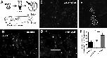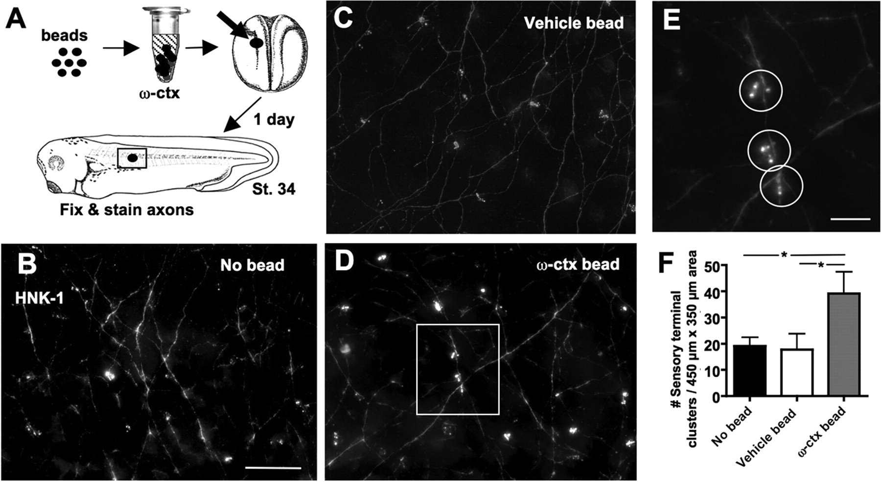 Blocking signaling through CaV2.2 in vivo leads to increased innervation of the skin. A, Agarose beads soaked in 10 μM ω-conotoxin (ctx) were implanted in stage 16 embryos. After 1 d, stage 34 embryos were fixed and stained with anti-HNK-1 to reveal sensory processes and sensory nerve terminals innervating the skin. A 450 × 350 μm area centered around the bead was imaged and analyzed (box). B–D, Deconvolved and projected z-series through the skin of embryos in which no bead (B), a control bead (C), or an ω-conotoxin bead (D) were implanted. Scale bar, 50 μm. E, Enlarged image of the boxed region in D showing three sensory nerve terminal clusters, circles. Scale bar, 10 μm. F, Embryos exposed to ω-conotoxin exhibited significantly greater numbers of sensory nerve terminal clusters compared with embryos implanted with a vehicle bead or no bead (*p < 0.05). Error bars indicate SEM.