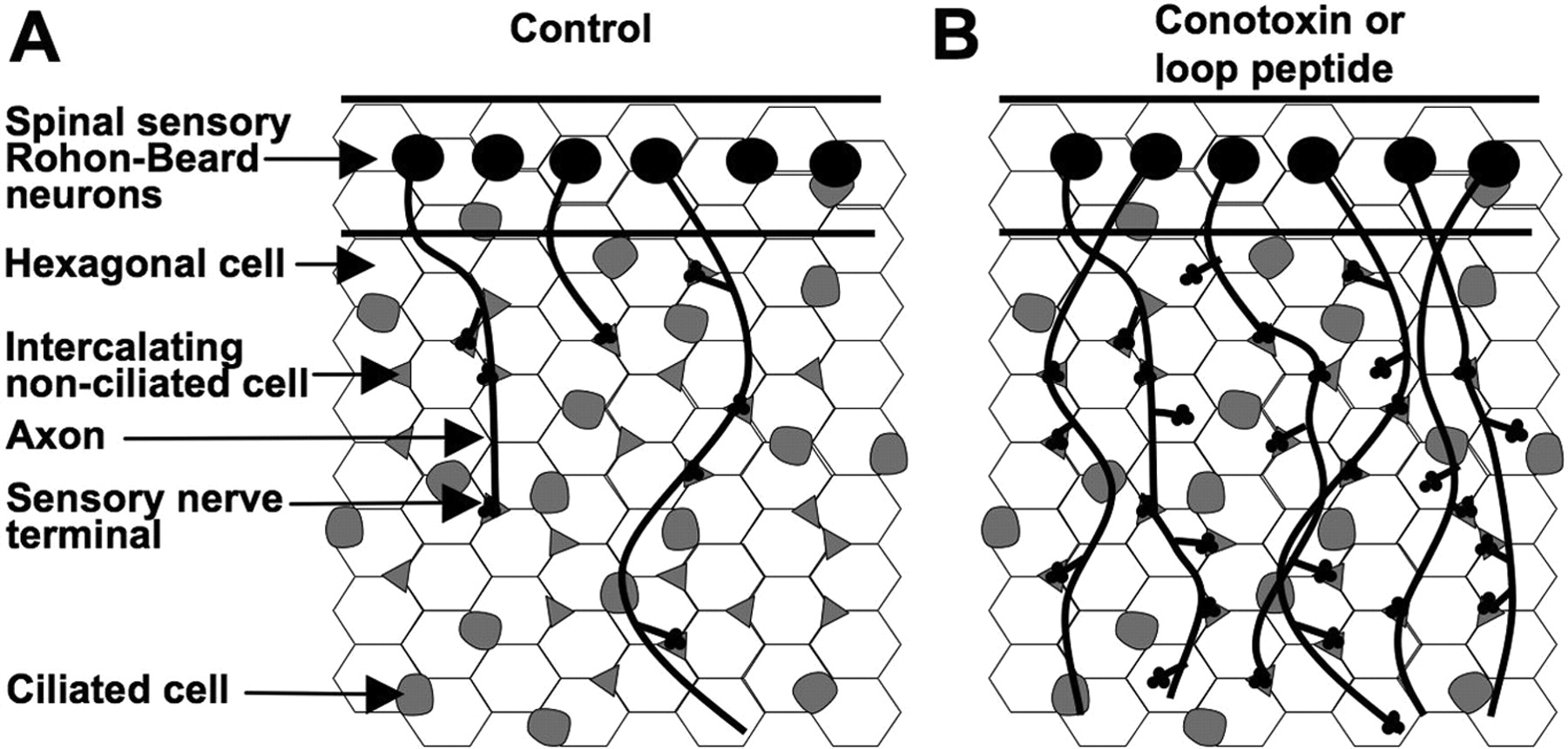 Model of laminin β2 and CaV2.2 interactions in development of skin innervation. A, In control conditions, outgrowing sensory terminals are inhibited or slowed by laminin β2-rich regions of the skin coextensive with hexagonal cells (white). B, The number of sensory nerve terminals increases when signaling interactions between laminin β2 and CaV2.2 are blocked.