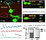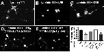 Neurons at a border of laminin β2 generate calcium transients and stall. A, Neurons were cultured on stripes of native and UV-denatured laminin β2 LRE fragment and internal calcium concentrations were imaged using Fluo-4. Images were captured at 2 Hz. Fluo-4 is in green, denatured laminin β2 is in red, and native laminin β2 is in black. Three images were averaged to enhance visualization of the neuron. Traces show the calcium activity in each of three growth cones as they encounter the border. Axis scales apply throughout the figure. B, C, Less calcium transient activity is seen when a neuron approaches (B) or has crossed onto (C) activated point mutated laminin β2 (LRE→QRE). D, Significantly more neurons stop or turn back at an LRE border than a QRE border (*p < 0.001).