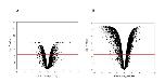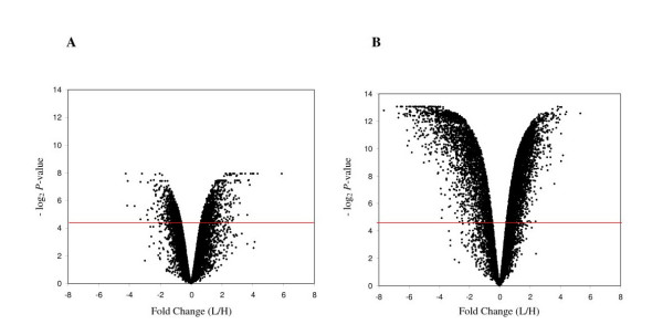 Figure 1. Volcano plots of gene expression. Volcano plots from FDR corrected t-tests of statistical significance (vertical axis) against magnitude of expression change (horizontal axis), where each point corresponds to a gene/transcript. Expression change (fold-change) is defined as a log2-transformed ratio of mean nonhybrid to mean hybrid expression level. (A) Xenopus laevis (L) vs. Hybrids (H); (B) Xenpous muelleri (M) vs. Hybrids (H). The red horizontal line denotes FDR adjusted alpha 0.05. The horizontal deviation from 0 towards the right or left reflects hybrid underexpression or overexpression, respectively.