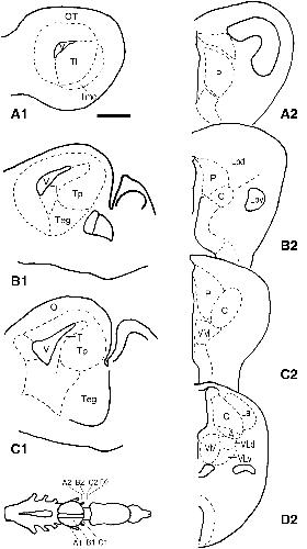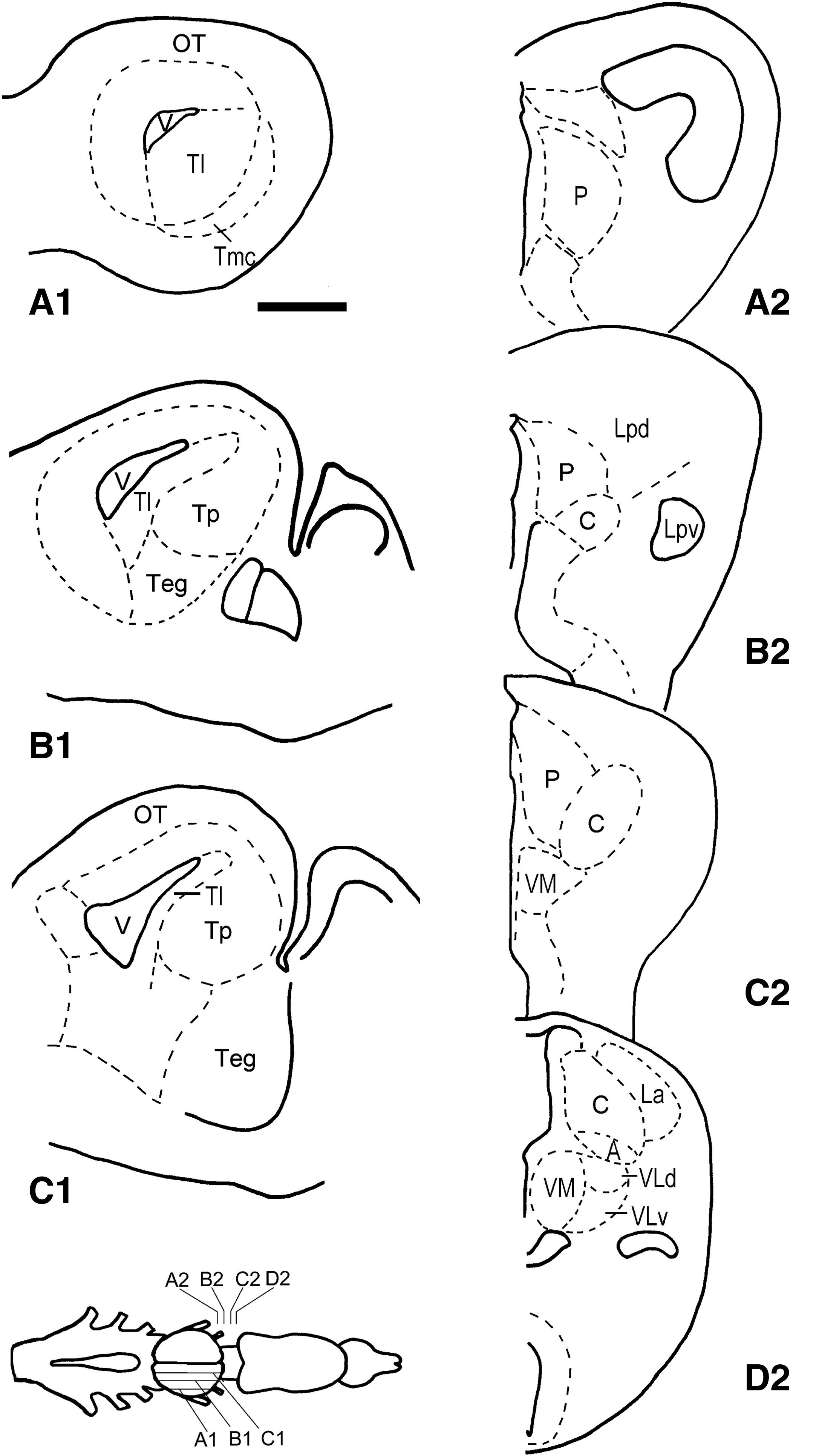 Schematic diagrams of mesencephalic and diencephalic auditory areas in X. laevis around the end of metamorphosis. Mesencephalic auditory nucleus, comprising the principal nucleus (Tp), the laminar nucleus (Tl) and the magnocellular nucleus (Tmc), is equally divided into four portions with about 200 μm interval by three saggital planes (A1, B1 and C1). Diencephalic auditory nucleus, comprising the posterior thalamic nucleus (P) and the central thalamic nucleus (C), is equally divided into five parts with about 200 μm interval by four coronal brain planes (A2, B2, C2 and D2). The locations of saggital (A1–C1) and coronal (A2–D2) planes in the brain are shown in the insert (rostral is to the right). These planes will be adopted in the following figures. Dorsal is up for A1–D2, and medial is left for A2-D2. Scale bar = 0.5 mm for A1-D2. For other abbreviations, see list.