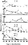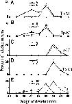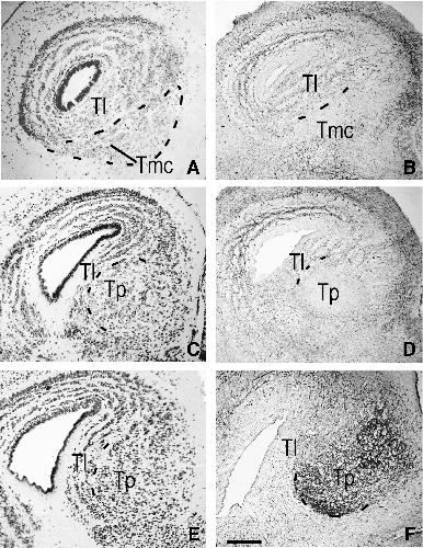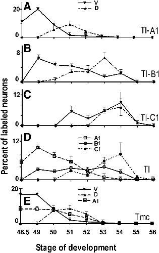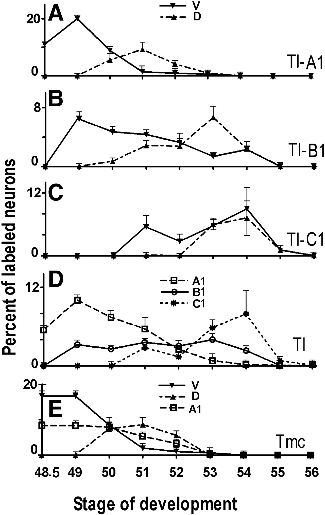 Percentages of labeled neurons during development in the laminar nucleus (Tl) and the magnocellular nucleus (Tmc). A–C: Percentages of labeled neurons in the dorsal and ventral portions of Tl at the A1 (A), B1 (B) and C1 (C) brain planes. A1–C1 planes are indicated in Fig. 1. D: Percentages of labeled neurons in the whole Tl (dorsal and ventral portions are combined) at A1–C1 brain planes. E: Percentages of labeled neurons in the dorsal and ventral Tmc, and in the whole Tmc (dorsal and ventral portions are combined). V: ventral portion. D: dorsal portion.