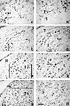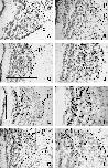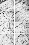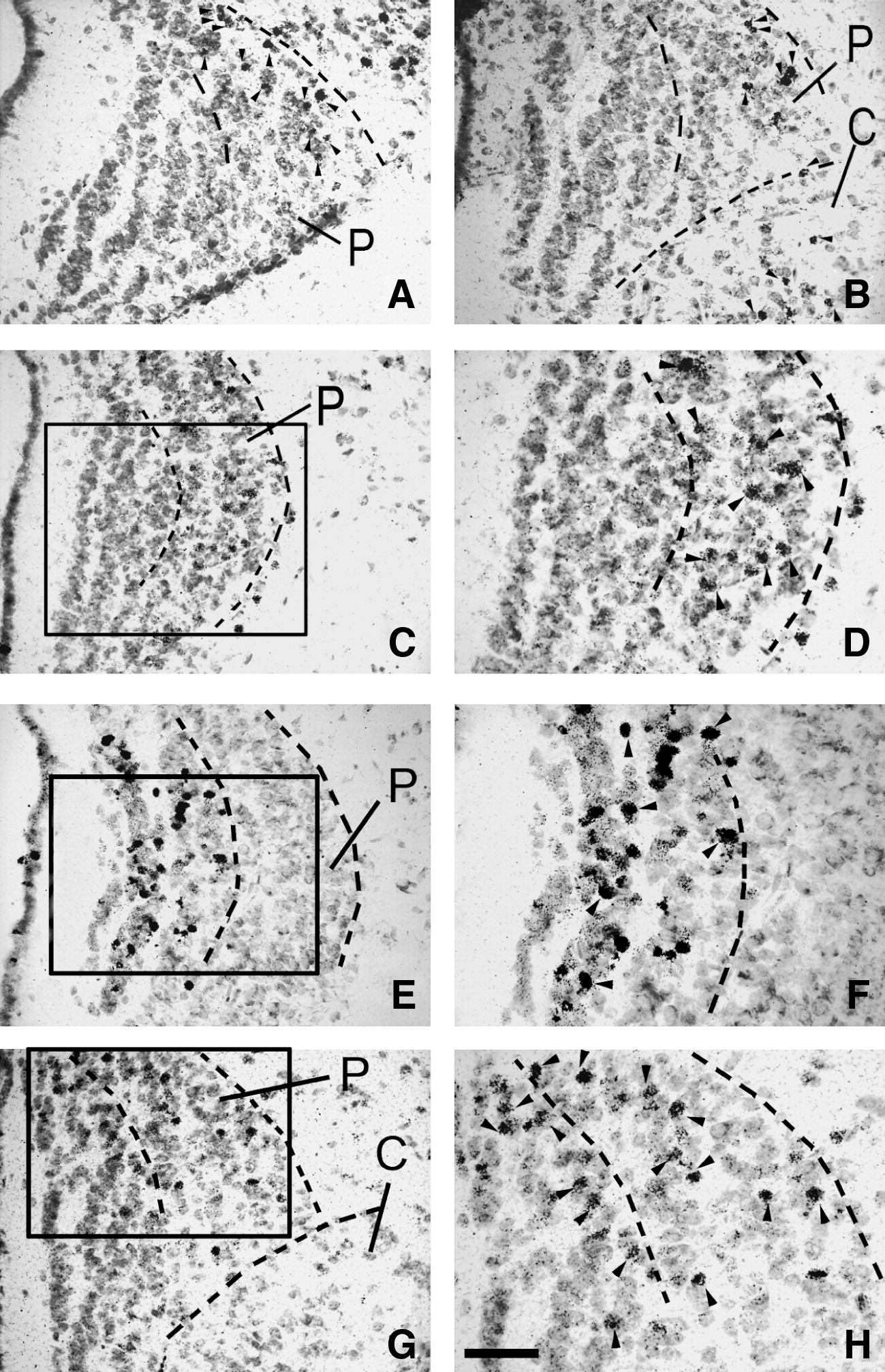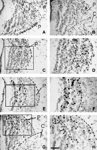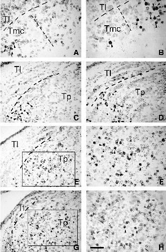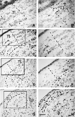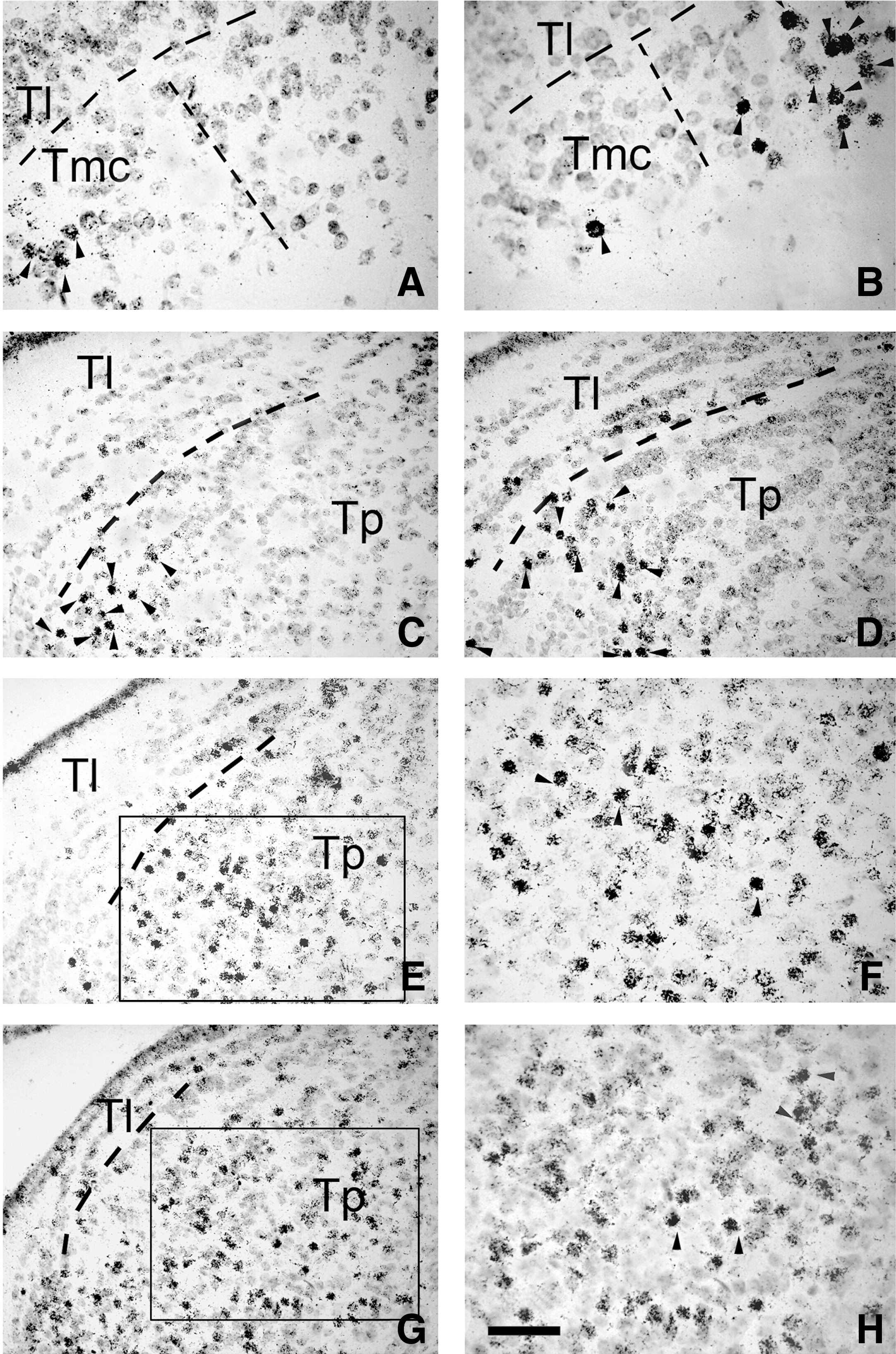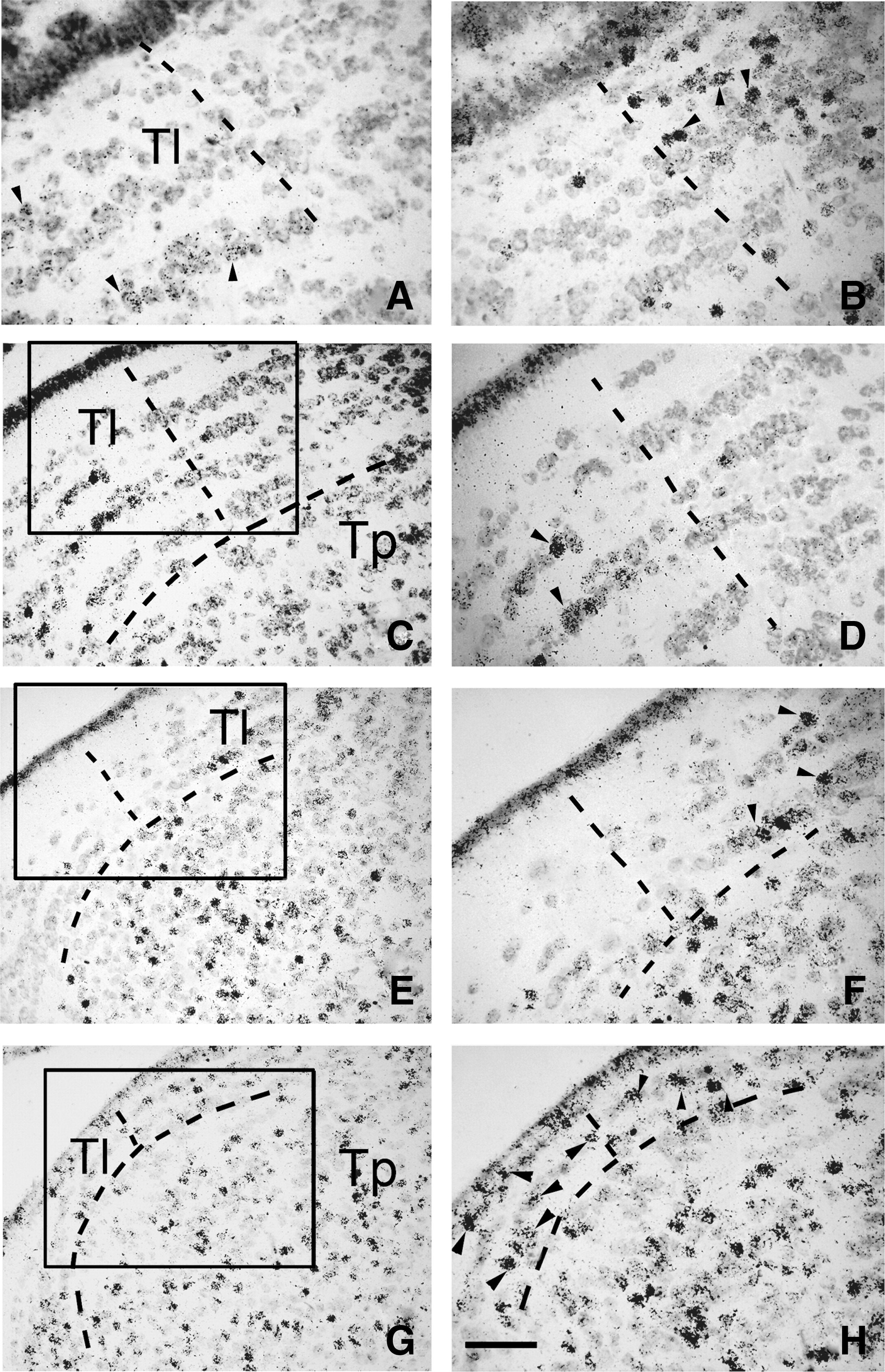 [3H]-thymidine labeling in the laminar nucleus (Tl). A and B: Peak of [3H]-thymidine labeling in the ventral Tl at stage 49 (A) and in the dorsal Tl at stage 51 (B) at the lateral brain plane (shown in Fig. 1A1). C–F: Peak of [3H]-thymidine labeling in the ventral Tl at stage 49 (C and D) and in the dorsal Tl at stage 53 (E and F) at the intermedial brain plane (shown in Fig. 1B1). G and H: Peak of [3H]-thymidine labeling in the ventral and dorsal Tl at stage 54 (B) at the medial brain plane (shown in Fig. 1C1). Dorsal and ventral portions are divided by dashed lines. D, F and H are the magnifications of the boxed areas in C, E and G, respectively. Some labeled cells are pointed by arrow heads. [3H]-thymidine labeling shows lateral (earlier, stage 49)-to-medial (later, stage 54) and dorsal-to-ventral neurogenetic gradients in lateral and intermedial sagittal planes (A–F), but not in the medial plane (G and H). Scale bar represents 50 μm for D, F and H, and 80 μm for others.