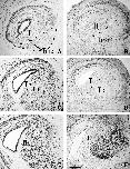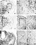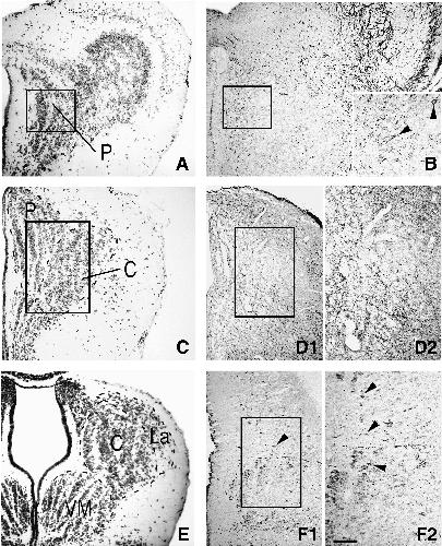 Nissl-staining (A, C and E) and immunoreactivity for substance P (D1 and D2) and parvalbumin (B, F1 and F2) in three coronal planes of the diencephalic auditory areas. The location of A, C and E in the brain are shown in Fig. 1A2, C2 and D2, respectively. The brain locations are similar between A and B, and among D1/D2, F1/F2 and C. The insert of B is corresponded to the boxed area in A and B, and D2 corresponds to the boxed area in C and D1. F2 is the boxed area of F1. Some heavily labeled cells are pointed by arrow heads in B, F1 and F2. Scale bar represents 100 μm for the insert of B, D2 and F2, and 200 μm for others. For abbreviations, see list.