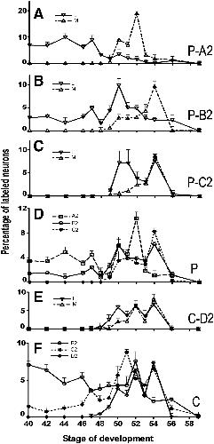 Percentages of labeled neurons during embryonic development in the posterior thalamic nucleus (P) and the central thalamic nucleus (C). A–C: Percentages of labeled neurons in the lateral and medial portions of P at the A2 (A), B2 (B) and C2 (C) brain planes. D: Percentages of labeled neurons in the whole P (lateral and medial portions are combined) at A2, B2 and C2 brain planes. E: Percentages of labeled neurons in the lateral and medial portions of C at the D2 brain plane. F: Percentages of labeled neurons in the whole P at B2, C2 and D2 brain planes. L: lateral. M: medial. R: rostral. C: caudal. A2, B2, C2 and D2: sagittal planes shown in Fig. 1.