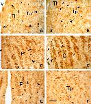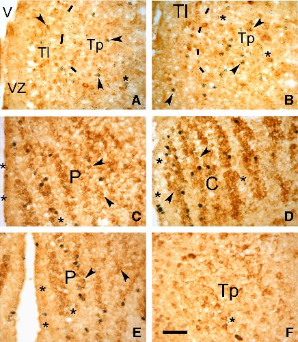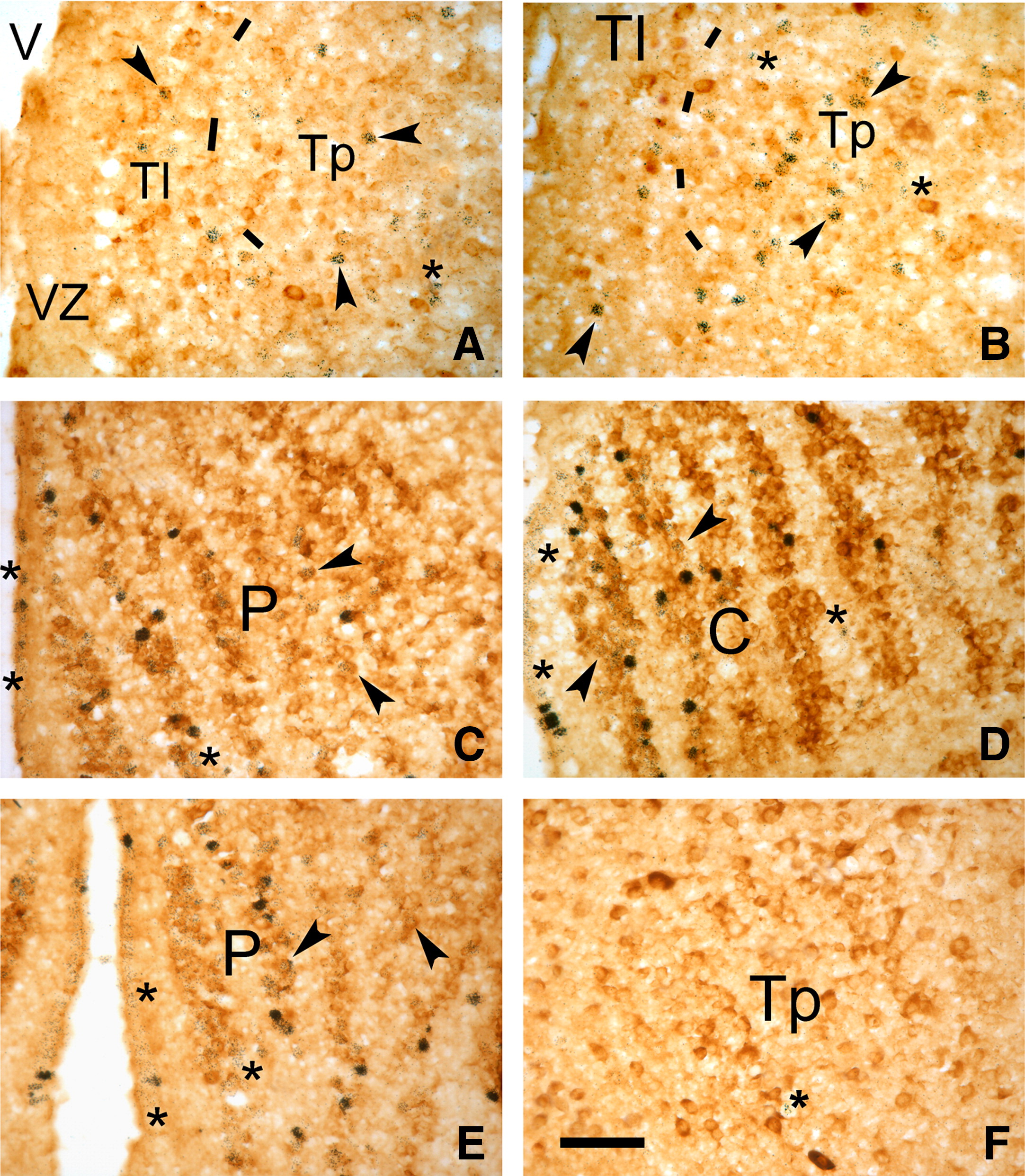 Cells labeled by [3H]-thymidine and the pre-neuronal marker Hu. A-B: Labeled cells in the laminar nucleus (Tl) and the principal nucleus (Tp) at the stage 54 (A) and 55 (B). The locations of A and B in the brain are corresponded to Fig. 1 ; Fig. 2 C or D, respectively. C–E: Labeled cells in the posterior thalamic nucleus (P) and the central thalamic nucleus (C) at the stage 56. The locations of C, D and E in the brain are corresponded to Fig. 1 B2, D2 and C2, respectively. F: Labeled cells in the Tp at the stage 56. Some double-labeled cells are pointed by arrowheads. Some labeled cells only by [3H]-thymidine are marked with asterisk, and these cells are rich in the thalamic ventricle (C-E). Scale bar represents 50 μm from A to E.