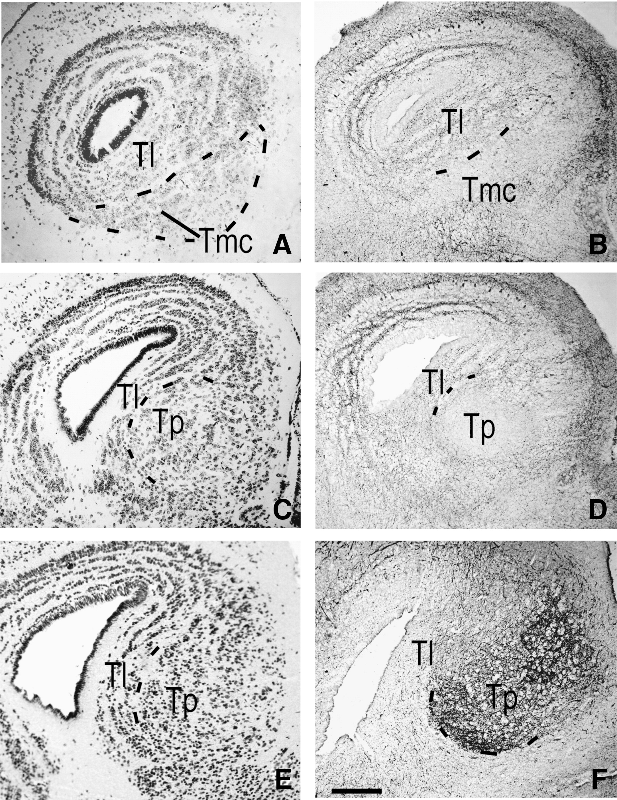 Nissl-staining (A, C and E) and immunoreactivity for substance P (B and D) and parvalbumin (F) in three sagittal planes of the torus semicircularis (TS). The locations of A, C and E in the brain are shown in Fig. 1A1, B1 and C1, respectively. Although images AâF are not from the same animal, A, C and E are located in similar brain positions to B, D and F, respectively. Tp boundaries shown by Nissl-staining and SP or PV immunohistochemistry are approximately consistent. However, Tp is smaller in SP immunohistochemistry than it in Nissl-staining. Scale bar represents 200 μm for AâF. For abbreviations, see list.