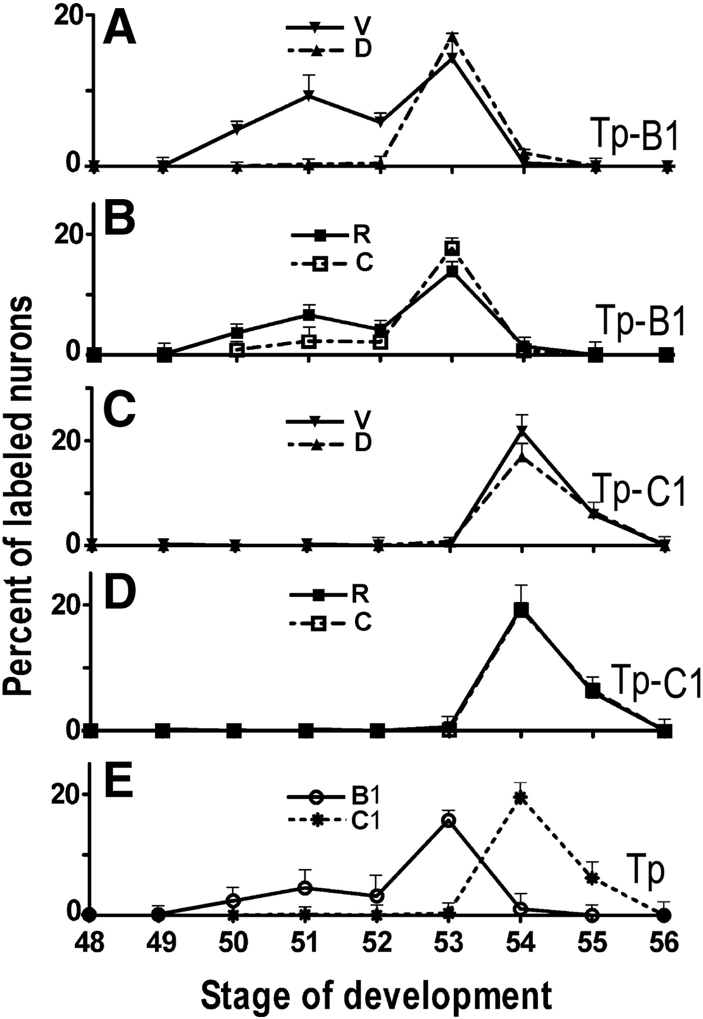 Percentages of labeled neurons during development in the principal nucleus (Tp). A–D: Percentages of labeled neurons in the dorsal and ventral portions of Tp at the B1 (A), and C1 (C) brain planes, and in the rostral and caudal portions of Tp at the B1 (B), and C1 (D) brain planes. E: Percentages of labeled neurons in the whole Tp (dorsal/ventral and rostral/caudal portions are combined) at B1 and C1 brain planes. V: ventral. D: dorsal. R: rostral. C: caudal. B1 and C1: sagittal planes shown in Fig. 1.