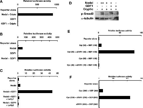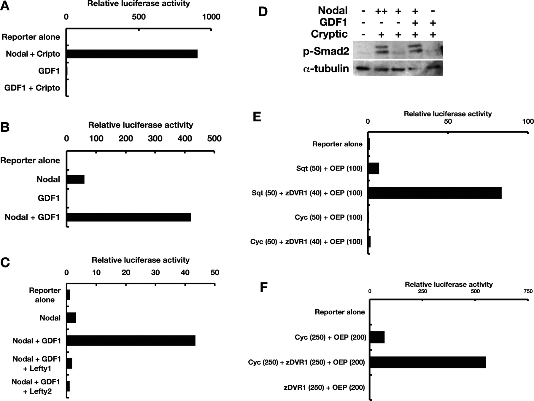 Figure 2. GDF1 is not an active ligand but enhances Nodal activity. (AâC) The activity of the Nodal-responsive reporter (n2)7luc in the Xenopus animal cap assay was determined after injection of mRNAs for Nodal (10 pg), GDF1 (1000 pg), or the Nodal coreceptor Cripto (20 pg) (A); of mRNAs for Nodal (2 pg) or GDF1 (40 pg) (B); or of mRNAs for Nodal (2 pg), GDF1 (40 pg), Lefty1 (50 pg), or Lefty2 (50 pg) (C). All embryos in B and C were also injected with 100 pg of the mRNA for the Nodal coreceptor Cryptic. (D) Xenopus embryos were injected with mRNAs for Nodal (++, 50 pg; +, 10 pg), GDF1 (40 pg), or Cryptic (100 pg), as indicated, after which animal caps were subjected to immunoblot analysis with antibodies to phospho-Smad2 (p-Smad2) or to α-tubulin (loading control). (E,F) The animal cap assay was also performed with mRNAs for zDVR1, Squint (Sqt), Cyclops (Cyc), or Flag-tagged OEP (OEP), as indicated. Injected mRNA amounts are shown in picograms (in parentheses).