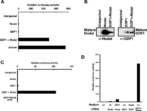 Figure 4. Interaction with GDF1 increases Nodal activity. (A) Conditioned medium prepared from Xenopus oocytes expressing Nodal, GDF1, or Activin, as indicated, was assayed for activity in a Xenopus animal cap assay with the Nodal-responsive reporter (n2)7luc. (B) Immunoblot analysis of the conditioned media (10 μL) used for the assay in A. The GDF1 protein coexpressed with Nodal in frog oocytes migrated slightly faster than did that expressed in the absence of Nodal. This was also true when GDF1 was expressed with or without Nodal in COS cells (Supplementary Fig. S6). (C) Conditioned medium prepared from Xenopus oocytes expressing Nodal, GDF1, or both proteins (GDF1 + Nodal) was assayed for activity as in A. For âGDF1/Nodal (mix),â conditioned medium for GDF1 and that for Nodal were prepared separately and mixed. (D) Frog embryos were injected with (n2)7luc and mRNAs for Nodal (2 pg) or GDF1 (40 pg) as indicated (mRNA). Animal caps prepared from the embryos were then cultured in conditioned medium prepared from Xenopus oocytes expressing Nodal or GDF1 as indicated (Medium), after which the activity of (n2)7luc was determined. (Un) Uninjected. All embryos in A, C, and D were also injected with 100 pg of the mRNA for Cryptic.