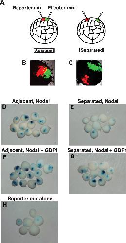 Figure 5. GDF1 increases the range of the Nodal signal in frog embryos. (AâC) Experimental strategy. The Nodal-responsive reporter (f1)6lacZ, mRNAs for Cryptic (125 pg) and the Activin type I receptor ALK4 (50 pg), and TRLDx were injected into a single blastomere of a 32- or 64-cell stage Xenopus embryo. (A) Nodal mRNA (250 pg), with or without Gdf1 RNA (225 pg), was injected together with FLDx into either an adjacent blastomere or a blastomere separated by one or two cells. Animal caps were prepared at stage 8.5, cultured for 3 h, and stained with X-gal. The fluorescence of TRLDx and FLDx was also monitored to reveal descendents of the adjacent (B) or separated (C) injected cells. (DâH) X-Gal-stained animal caps for adjacent (D,F) or separated (E,G) blastomeres injected with Nodal mRNA alone (D,E) or with Nodal mRNA plus Gdf1 mRNA (F,G) in the effector mix. (H) An X-gal-stained animal cap derived from an embryo injected with only the reporter mix is also shown.