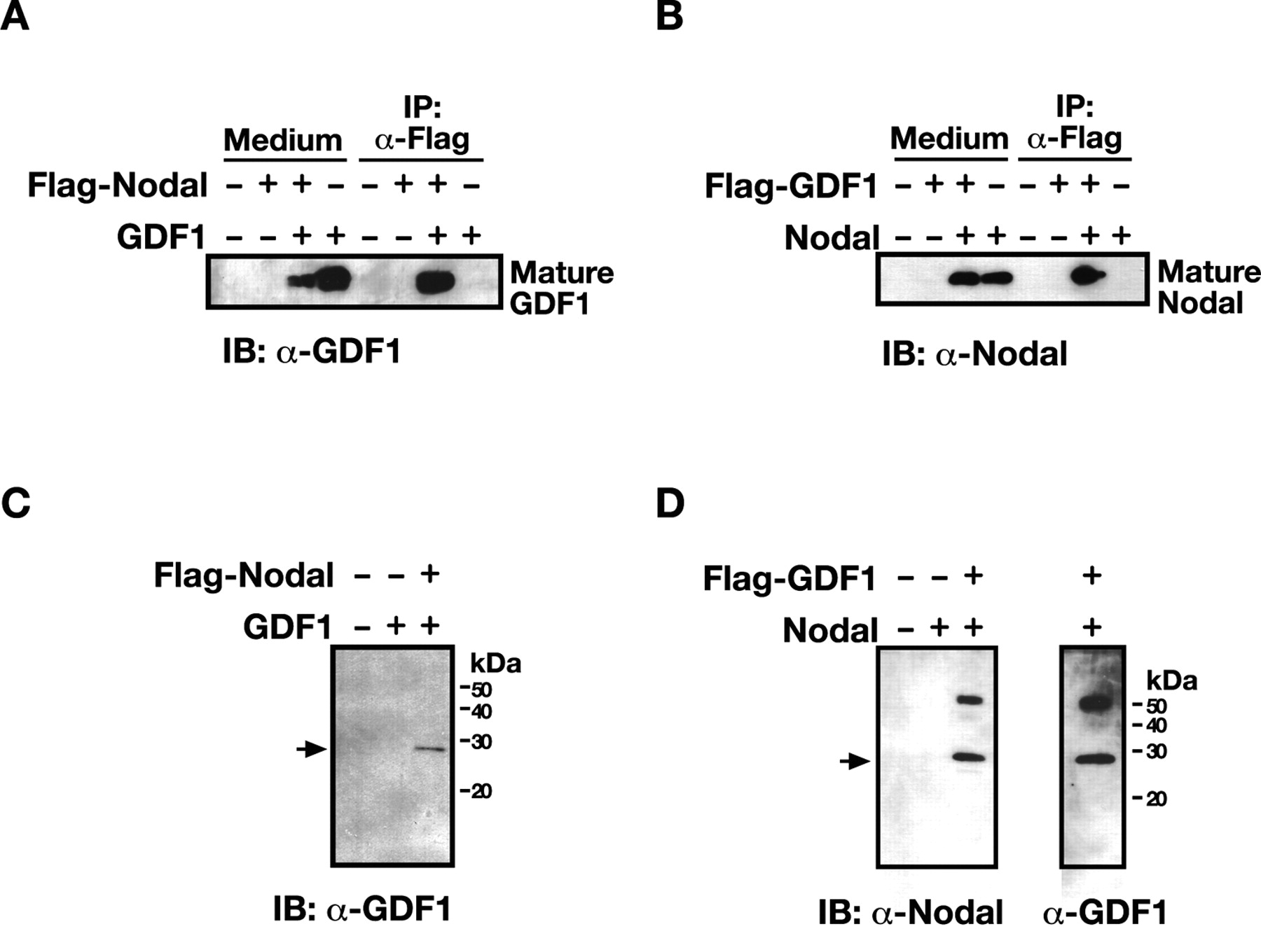 Figure 3. GDF1 Interacts with Nodal. (A) Conditioned medium prepared from Xenopus oocytes expressing Flag-Nodal or GDF1, as indicated, was subjected to immunoprecipitation (IP) with antibodies to Flag (α-Flag). The resulting precipitates as well as the conditioned medium were subjected to immunoblot analysis (IB) under reducing conditions with antibodies to GDF1 (α-GDF1). (B) Conditioned medium prepared from Xenopus oocytes expressing Flag-GDF1 or Nodal, as indicated, was subjected to immunoprecipitation with antibodies to Flag. The resulting precipitates as well as the conditioned medium were subjected to immunoblot analysis under reducing conditions with antibodies to Nodal. (C) Conditioned medium prepared from Xenopus oocytes expressing Flag-Nodal or GDF1, as indicated, was subjected to immunoprecipitation with antibodies to Flag, and the resulting precipitates were subjected to immunoblot analysis under nonreducing conditions with antibodies to GDF1. Arrow indicates a Flag-NodalâGDF1 heterodimer. (D) Conditioned medium prepared from Xenopus oocytes expressing Flag-GDF1 or Nodal, as indicated, was subjected to immunoprecipitation with antibodies to Flag, and the resulting precipitates were subjected to immunoblot analysis under nonreducing conditions with antibodies to Nodal or to GDF1. Arrow indicates a Flag-GDF1âNodal heterodimer. The lower-mobility band corresponds to a heterodimer of Nodal and of Flag-GDF1 that was not cleaved at the proteolytic cleavage site.