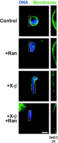 Figure 2. Xenopus importin beta is an authentic negative regulator of the fusion events in nuclear membrane formation. Addition of His-tagged Xenopus importin beta to a nuclear assembly reaction (+X-β) blocked nuclear membrane fusion, as shown by the lack of a solid nuclear rim stain by the green fluorescent membrane dye DHCC. The block to membrane fusion could be rescued by the addition of RanQ69L-GTP (+X-β +Ran). Where indicated, the added concentrations were 30 μM Xenopus importin beta and/or 40 μM RanQ69L-GTP. DNA was stained with DAPI. These observations are in accordance with experiments done with recombinant human importin beta in nuclear assembly reactions [9]. To better view the membranes, a section of the membrane stain (white dashed box) is enlarged by 3X (right panels). The bar represents 10 microns.