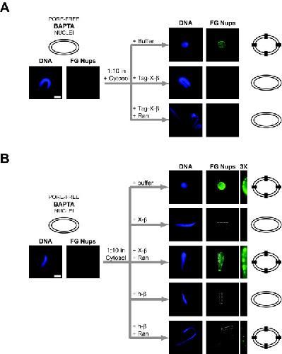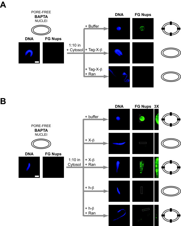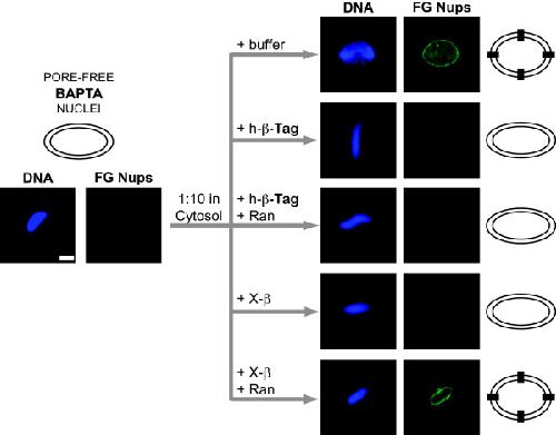 Figure 3. Xenopus importin beta is an authentic negative regulator of nuclear pore assembly and is reversed by RanGTP. Pore-free BAPTA nuclear intermediates, which have fused nuclear membranes but contain no nuclear pores (left panel), when diluted into fresh cytosol (+ buffer), incorporate nuclear pores. The addition of His-tagged human importin beta (+h-β-Tag) or Xenopus untagged importin beta (+X-β) prevented nuclear pore assembly. Addition of RanQ69L-GTP with His-tagged human importin beta (+h-β-Tag +Ran) could not reverse the beta block to pore assembly, as previously observed [9]. However, addition of RanQ69L-GTP with untagged Xenopus importin beta (+X-β +Ran) did reverse the beta block to pore assembly. Nuclear pores were detected by the monoclonal antibody mAb414, which recognizes FG nucleoporins (FG Nups). Where indicated, importin beta was added at 20 μM and RanQ69L-GTP at 30 μM. The bar represents 10 microns. Black squares on the drawings at the right indicate FG-staining nuclear pores.