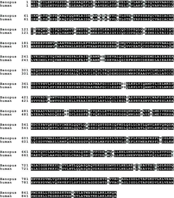 Figure 1. Xenopus importin beta shows close homology to human importin beta. The protein sequence of Xenopus importin beta shows very close homology to human importin beta with 94% identities (828/876, black boxes) and 97% positives (857/876 gray and black boxes). The amino acid composition, along with the length of the protein, is well conserved between Xenopus and human importin beta. Three of the conservative amino acid differences between the Xenopus and human importin beta sequence are at residues involved in FG-domain binding (F217Y [82–84], I265V [84], and L505V [84]).
