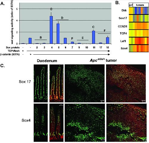Figure 1. Different Sox factors are antagonists or agonists of the canonical Wnt pathway and are expressed in the normal and neoplastic gut. (A) Effect of different Sox family members on Wnt signaling activity. 293T cells (shown) and COS cells (not shown) were transfected with Sox2, Sox3, Sox4, Sox5, Sox6, Sox7, Sox9, Sox10, Sox11, Sox17, and Sox18 together with a TCF-luciferase reporter plasmid (TOP-flash) and an expression plasmid encoding a stabilized form of β-catenin (carrying the S37A mutation). Transfection with β-catenin(S37A) alone resulted in significant activation of the reporter plasmid. Sox2, Sox3, Sox7, Sox9, Sox10, and Sox17 repressed the β-catenin-mediated activation of TOP-flash, whereas Sox4, Sox5, and Sox11 enhanced β-catenin/Wnt activity. Data are shown as ratios of the activity in cotransfected cells to the activity in cells transfected with β-catenin(S37A) alone. Transfection with Sox factors without β-catenin(S37A) did not result in significant TOP-flash activity (data not shown). Letters above the bars denote the Sox subfamily. Error bars indicate standard errors of the means for replicate samples from two separate experiments. â, absent; +, present. (B) Analysis of published microarray data (8, 32, 38). The expression levels of the Wnt antagonists Dkk and Sox17 were reduced in seven of eight tumor samples relative to those in the normal gut samples. The levels of expression of several pro-Wnt signaling genes, Sox4, TCF4, and LEF1, and the Wnt target gene cyclin D1 (CCND1) were elevated in tumor samples relative to those in normal gut samples. The color scale for normalized transcript levels is as follows: red, high; yellow, moderate; and blue, low. (C) Sox4 and Sox17 proteins are expressed in the normal gut epithelium and in APCmin/+ tumors. In the small intestine, Sox17 and Sox4 proteins (green) are expressed in the nuclei of the epithelial cells (a duodenum sample is shown). The Sox4 expression domain is located predominantly in the crypt, whereas Sox17 protein is found throughout the crypt and villus. The right panels show adjacent sections from APCmin/+ tumors in which Sox17 and Sox4 proteins appear to be in mutually exclusive domains. Nuclei are stained with the red nuclear dye PoPro3. Scale bars in duodenum panels, 50 μm. |