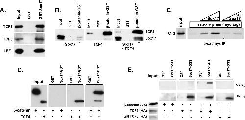 Figure 4. Sox17 forms a stable, trimeric complex with TCF/LEF and β-catenin proteins. (A) Sox17 interacts with TCF3, TCF4, and LEF proteins. Sox17-GST beads pulled down in vitro-translated, V5 epitope-tagged TCF4, TCF3, and LEF1, and GST beads did not. (B) The interaction between Sox17 and β-catenin is enhanced in the presence of TCF4. Sox17 or TCF4 independently bound to β-catenin-GST beads but not to GST beads alone (panels 1 and 2). The binding of Sox17 to β-catenin-GST beads was enhanced in the presence of TCF4 (compare the ratios of input to bound Sox17 in the presence and absence of TCF4 [lanes marked by *]). β-catenin-interacting proteins were analyzed by Western blotting with an anti-V5 antibody. (C) The interaction between β-catenin (β-cat) and TCF3 is stabilized by Sox17 and requires a Sox17-β-catenin interaction. In vitro-translated, S35-labeled TCF3 protein (input) was incubated with β-catenin (myc tagged) alone or with increasing concentrations of purified His-tagged Xenopus Sox17β or His-tagged Xenopus Sox17 consisting of amino acids 1 to 150, which removed the β-catenin interaction domain (ÎC Sox17). β-catenin and its associated proteins were precipitated with an anti-myc antibody, and TCF3 protein was analyzed by SDS-PAGE and autoradiography. IP, immunoprecipitate. (D and E) Under high-stringency conditions, Sox17-GST beads would not efficiently pull down β-catenin. However, in the presence of TCF4 (D) or TCF3 (E), Sox17 was able to pull down β-catenin. This interaction depends on the β-catenin interaction domain of TCF3, which is deleted in the N terminus-lacking TCF3 protein (ÎN TCF3). +, present; â, absent. |