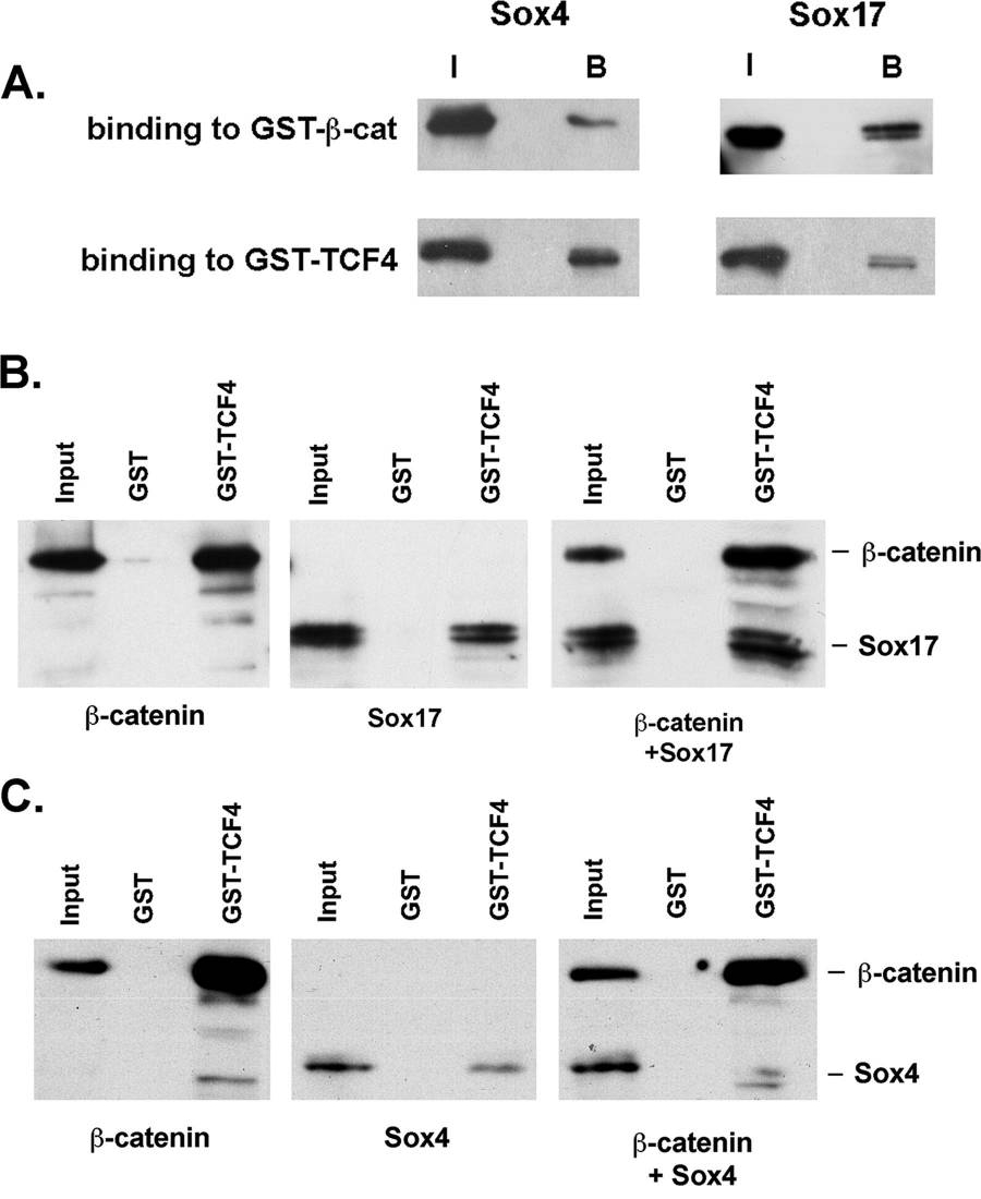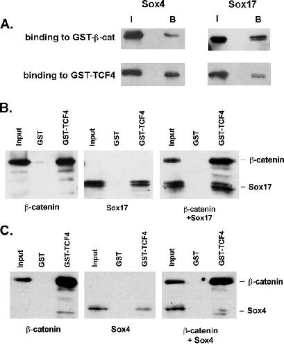 Figure 5. Sox4 and Sox17 have similar affinities for TCF4 and β-catenin, but Sox4 does not form a stable complex. (A) Sox4 has affinities for TCF4 and β-catenin (β-cat) similar to those of Sox17. The ratios of the input (I) and bound (B) protein fractions are similar for Sox17 and Sox4. (B) Sox17 formed a complex with β-catenin and TCF4. Also, more Sox17 protein was pulled down by TCF4-GST beads in the presence of β-catenin. (C) GST-TCF4 beads were able to pull down either β-catenin or Sox4 but did not efficiently pull down Sox4 in the presence of β-catenin. Moreover, Sox4 binding to TCF4 was somewhat inhibited in the presence of β-catenin, suggesting that Sox4 and β-catenin compete for binding. |