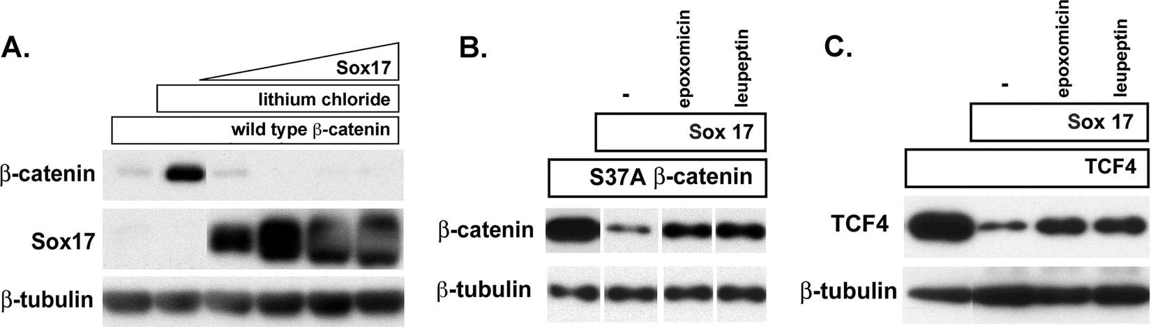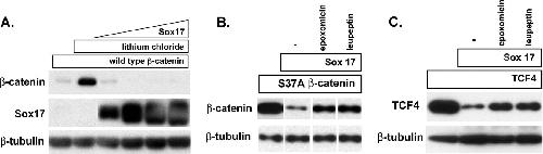 Figure 8. Sox17-mediated degradation of β-catenin and TCF4 is independent of GSK3β activity and mediated by the proteasome. (A) LiCl does not affect Sox17-mediated degradation of β-catenin. COS cells were transfected with an expression plasmid encoding wild-type β-catenin (100 ng; myc tagged) in the absence (lane 1) or presence(lanes 2 to 6) of 40 mM LiCl. Cells were cotransfected with increasing amounts of Sox17 plasmid (50, 100, 200, and 400 ng) and the wild-type β-catenin gene in the presence of lithium chloride (lanes 3 to 6). LiCl effectively stabilized wild-type β-catenin protein in the absence of Sox17 but could not inhibit Sox17-mediated degradation of wild-type β-catenin protein. (B and C) The proteasome inhibitor epoxomicin inhibits Sox17-induced degradation of stabilized β-catenin (B) and TCF4 (C). Cells were transfected with the β-catenin(S37A) mutant form (100 ng) or TCF4 (100 ng) alone or together with Sox17 (100 ng). Culturing cotransfected cells with epoxomicin (0.1 μM) or leupeptin (25 μM) inhibited Sox17-mediated degradation of β-catenin and TCF4 proteins. The lysosomal acidification inhibitor cholorquine (25 μM) had no effect (data not shown). â, control. |